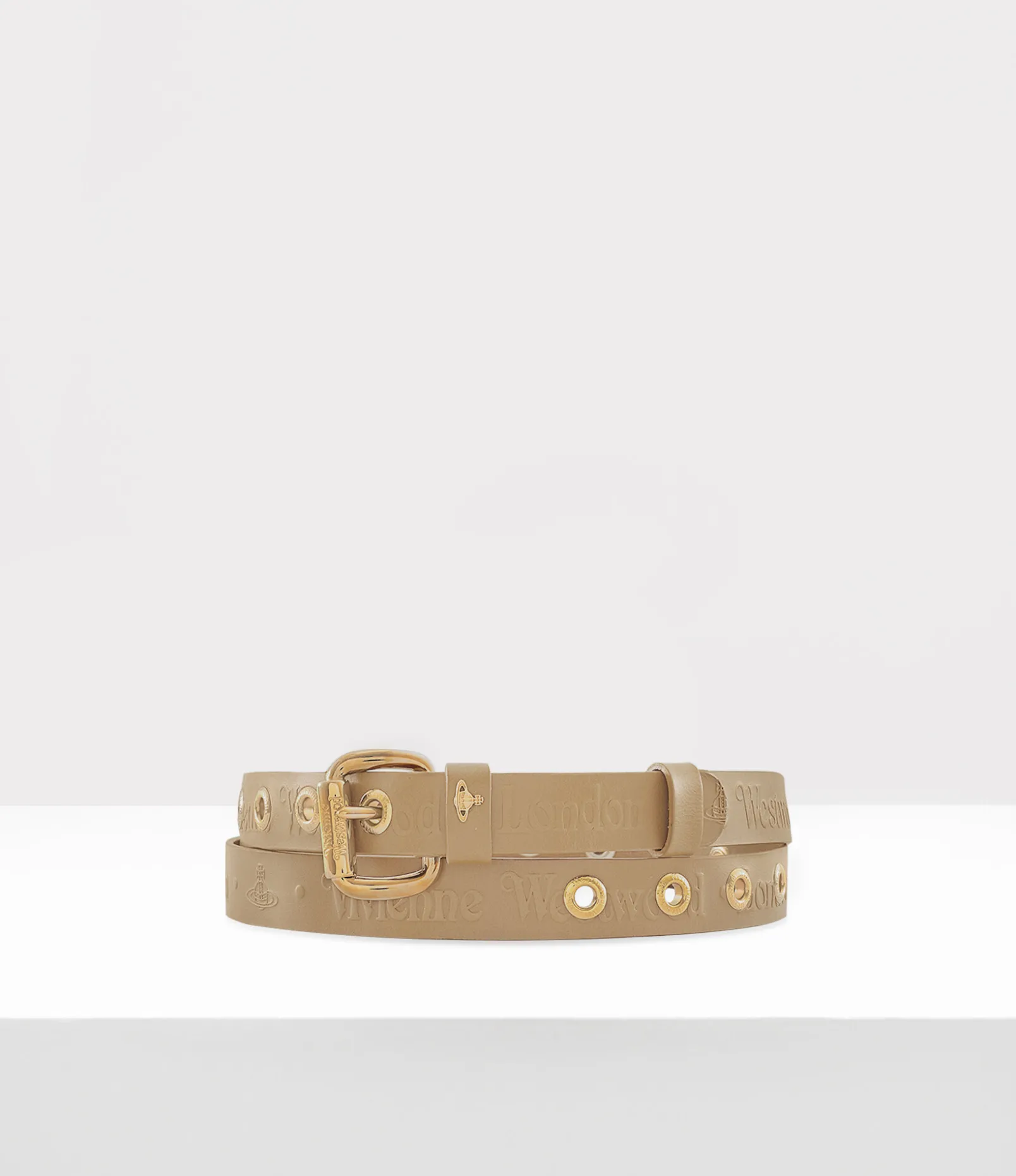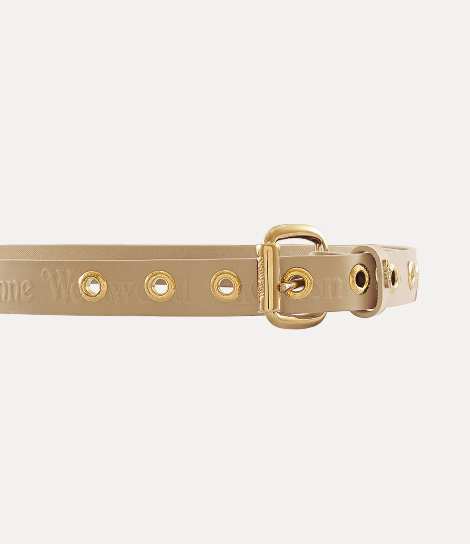 Our Carolina belt features a slim leather silhouette in beige tones, complete with polished metal eyelet details. The piece is is engraved with the house’s signature Vivienne Westwood letter branding, enhanced by an orb motif on the front loop – synonymous with Vivienne’s vision of launching tradition into the future.