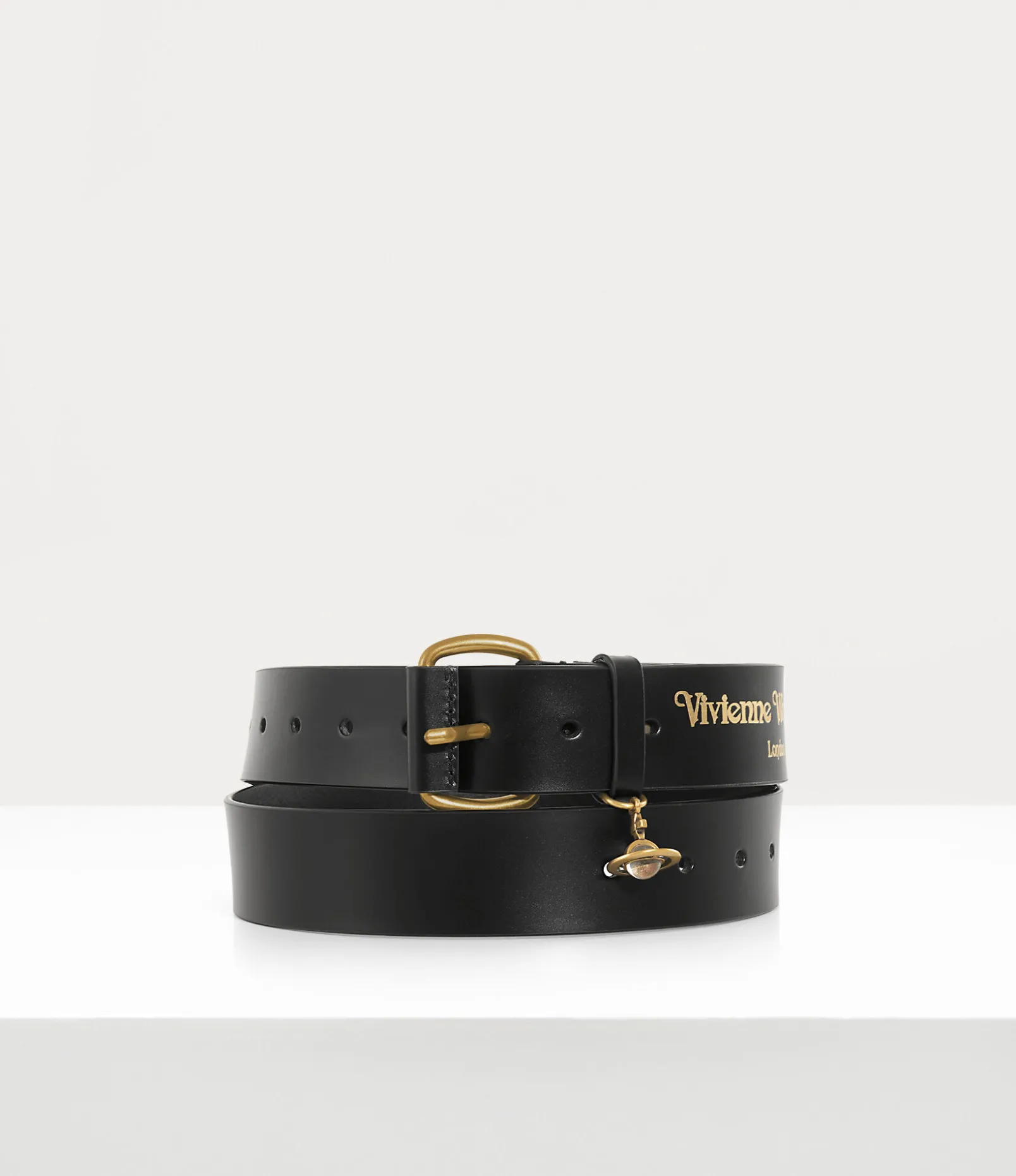 Our New Wide Alex Charm belt is a new development of the original ‘Alex belt’, from the Vivienne Westwood archives. The piece adopts a roller buckle closure with metal hardware details, complete with a gold-tone finish, along with our dangle orb motif at the front of the design – synonymous with Vivienne’s vision of launching tradition into the future.