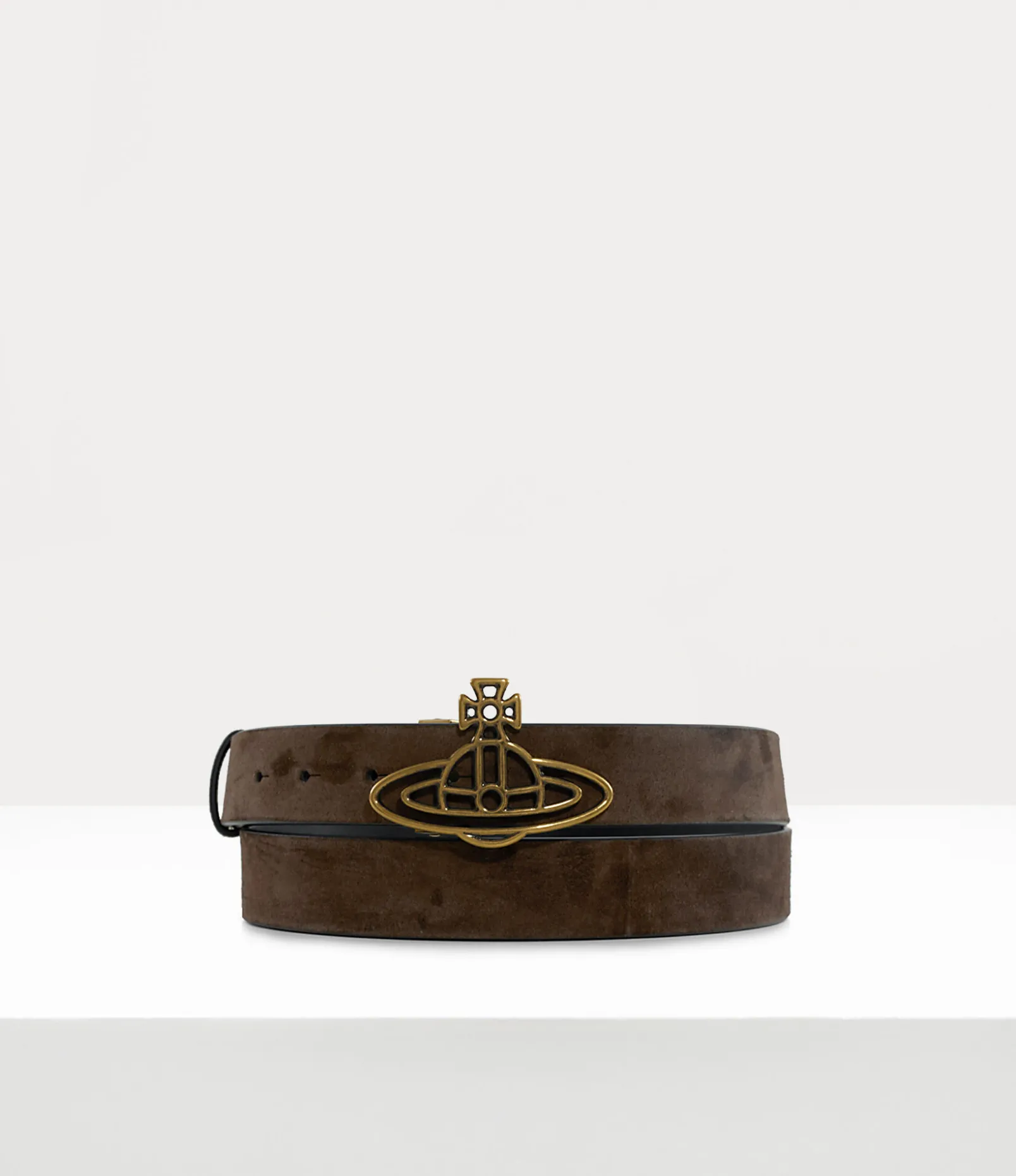 Our Thin Line Orb belt has been reimagined in this season’s soft suede fabric with tonal stitching and brass-plated hardware. The belt’s buckle revives our iconic ‘Thin Line Orb’ design, reflecting Vivienne’s vision of merging tradition with the future.