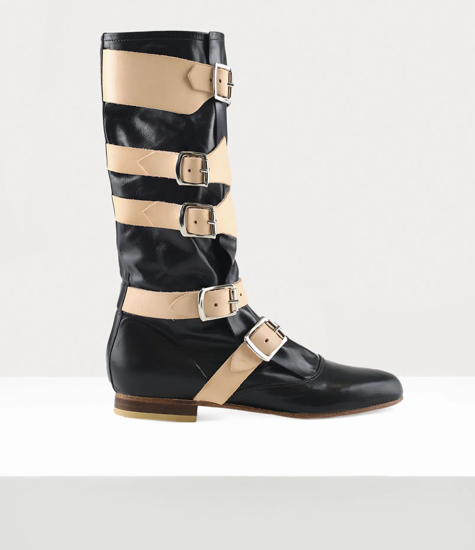 Our Pirate boots were first revealed in the Autumn-Winter 1981 ‘Pirate’ collection, which was influenced by Vivienne’s interest in adventurous pirate stories from the 17th and 18th centuries. The design captures the essence of romanticism and rebellion often linked to pirates, with soft, slouchy leather and oversized buckles that give the boots a rugged, distressed appearance.