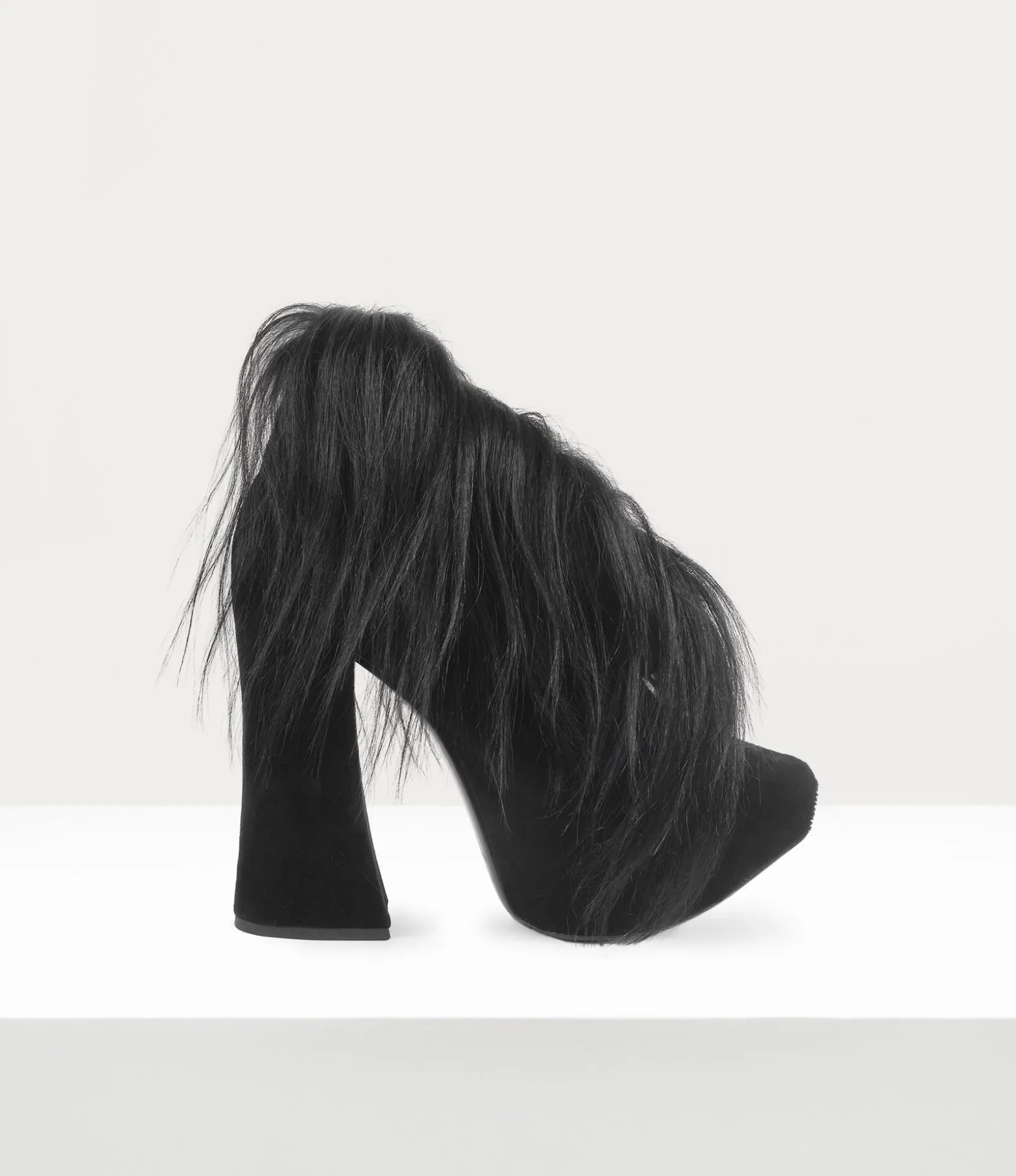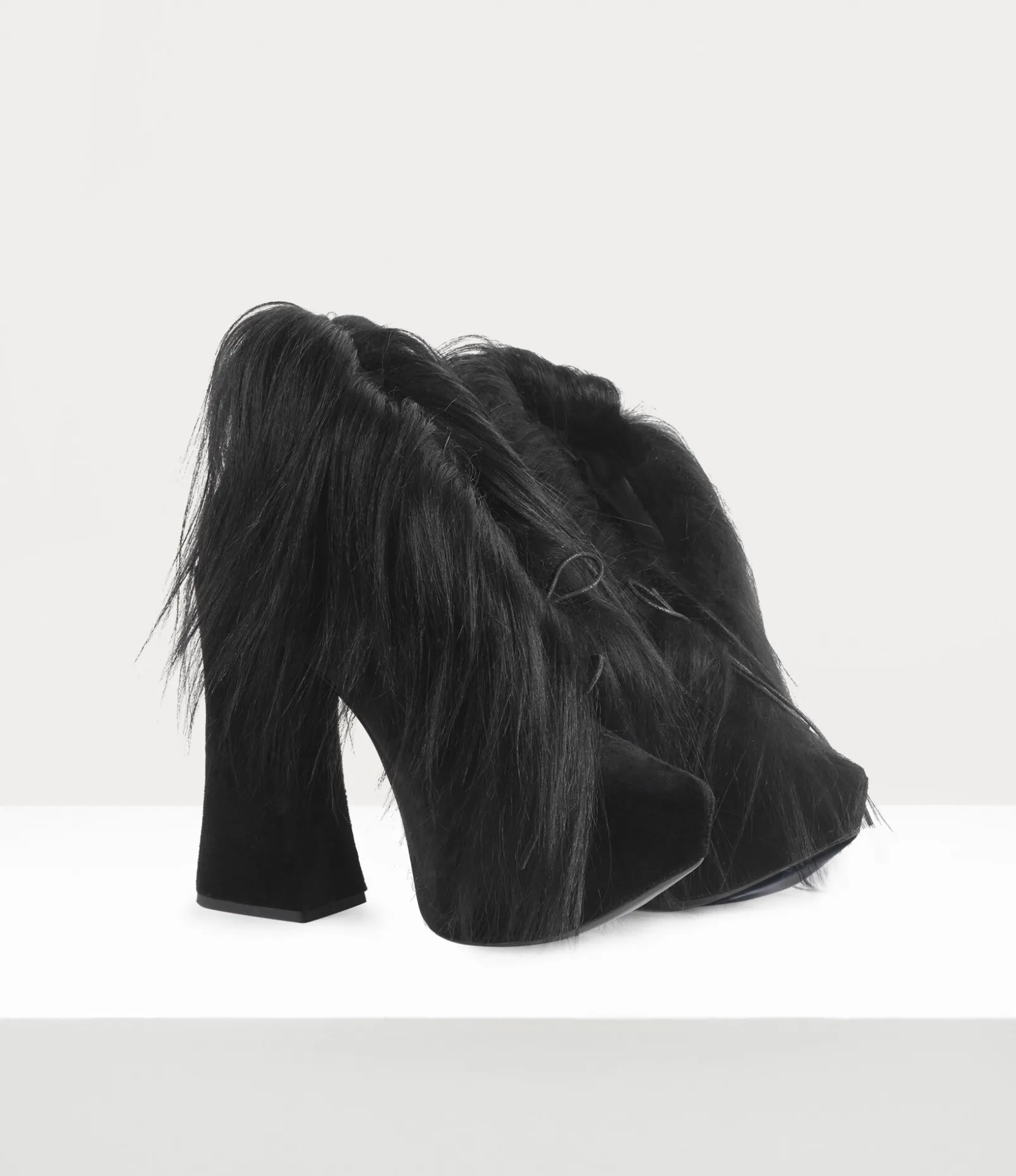 The Scottie boot reimagines an archival Vivienne Westwood design, from the Autumn-Winter ‘Save the Arctic’ collection in 2013-14. The piece features cascading black goat hair, evoking the rugged beauty of the Scottish Highlands, a key inspiration this season. The pointed platform nods to the iconic Mary Jane style, revisited in the Andreas Kronthaler for Vivienne Westwood Autumn-Winter 2023 collection.