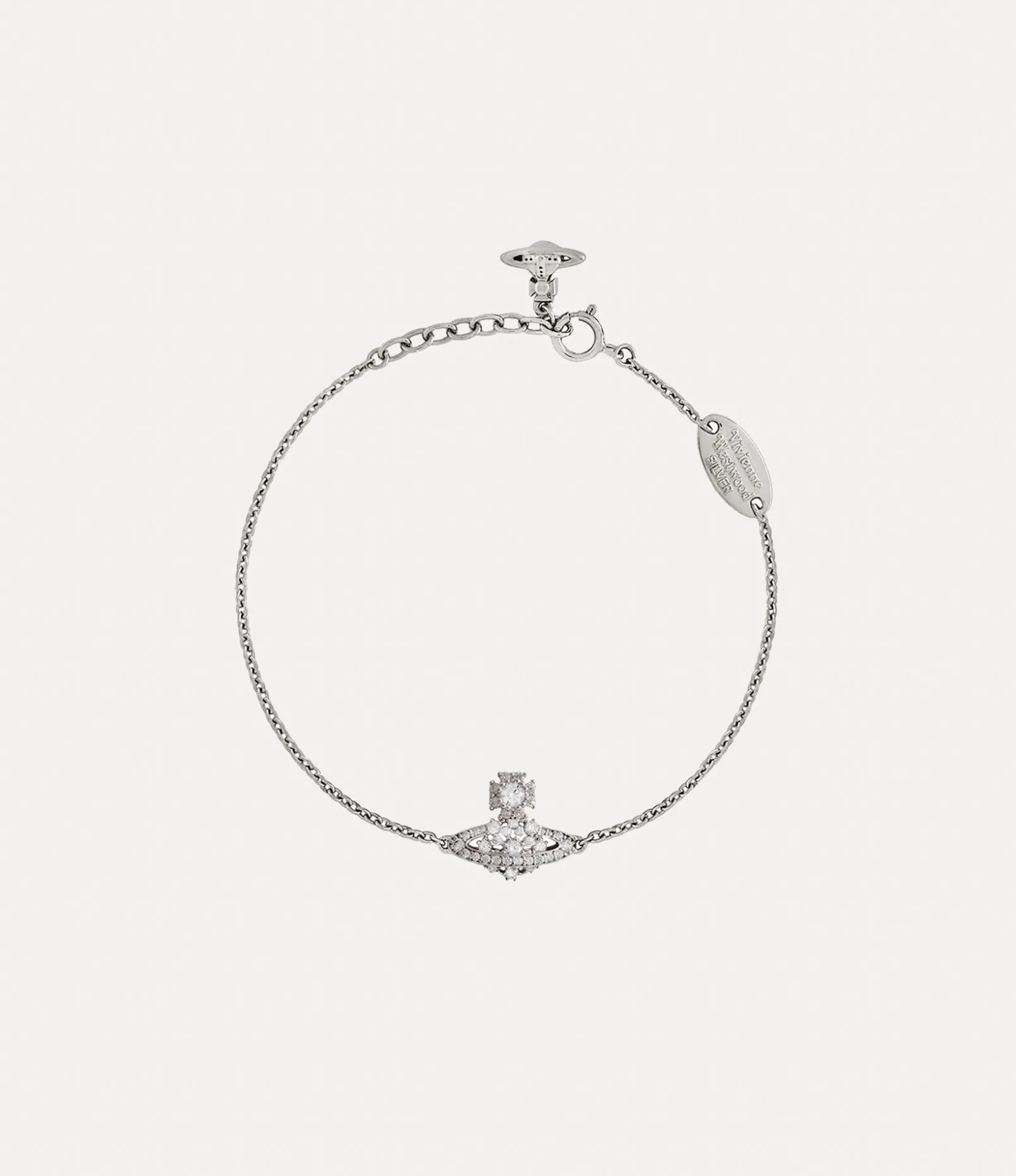 Our Narcissa bracelet features a platinum-plated silver finish, complete with weblike crystal embellishments that draw inspiration from intricate lacework detailing from the Vivienne Westwood archives. The piece receives an orb motif in the centre, synonymous with Vivienne’s vision of launching tradition into the future.