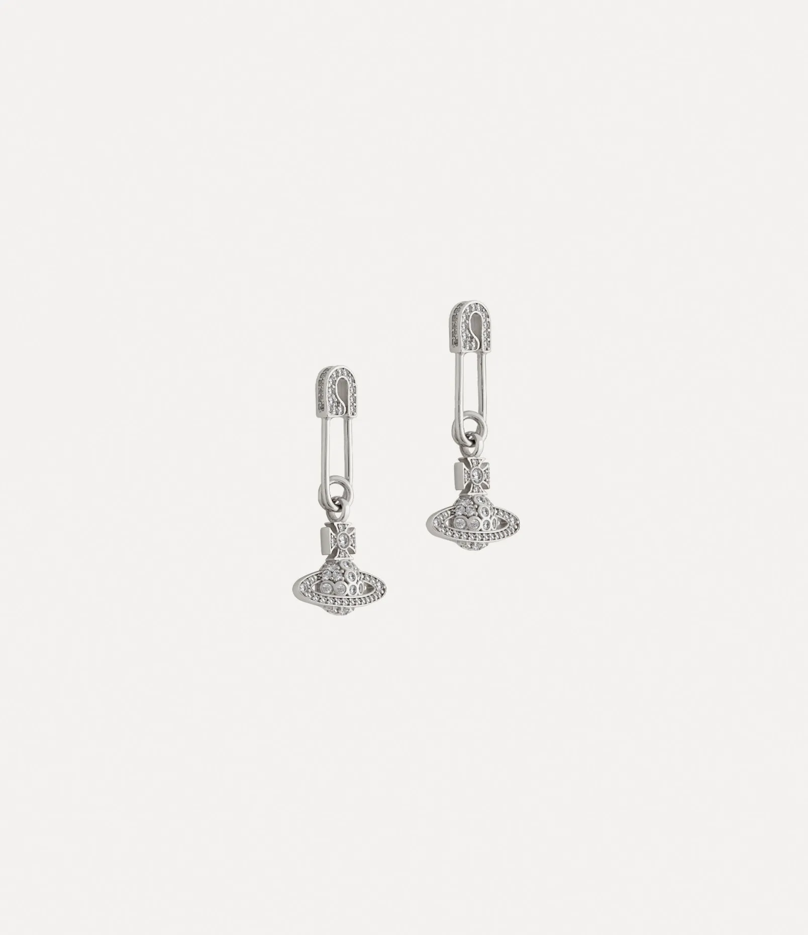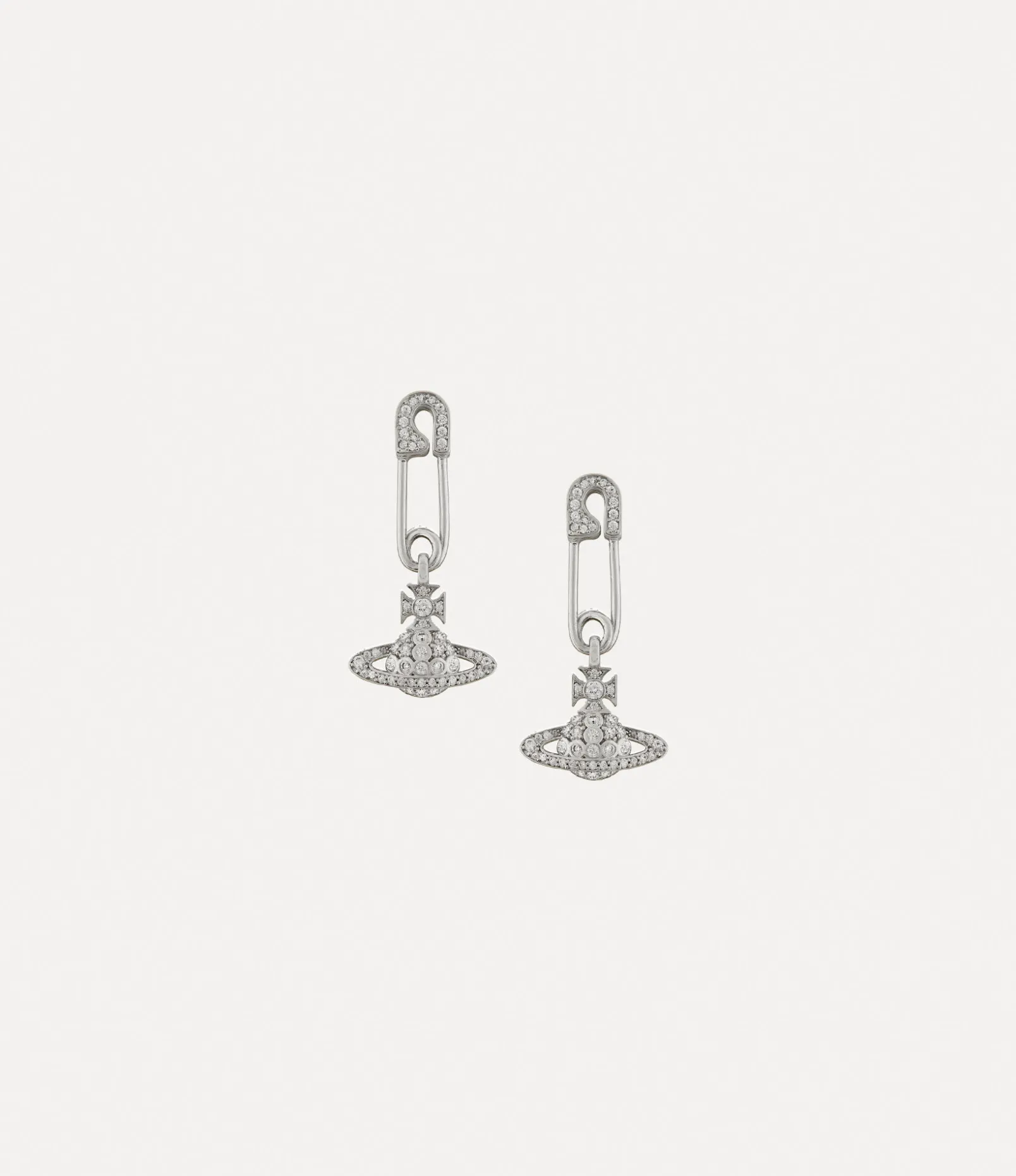 Our Lucrece earrings feature crystal-embellished details in silver-tone plating, highlighted by our signature safety pin motif alongside the iconic orb design. The safety pin, a timeless symbol of non-conformity, echoes Vivienne’s signature punk-inspired approach.