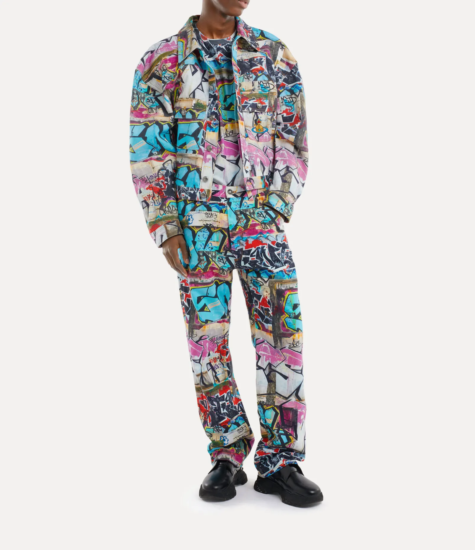The archive Graffiti motif, first showcased in the Andreas Kronthaler for Vivienne Westwood Autumn-Winter 2020-21 Paris show, reflects our house’s iconic punk aesthetic. This season, we have revisited the motif on our archive Denim Boxer jacket, which features an athletic-inspired silhouette with oversized pockets and lowered shoulder seams.