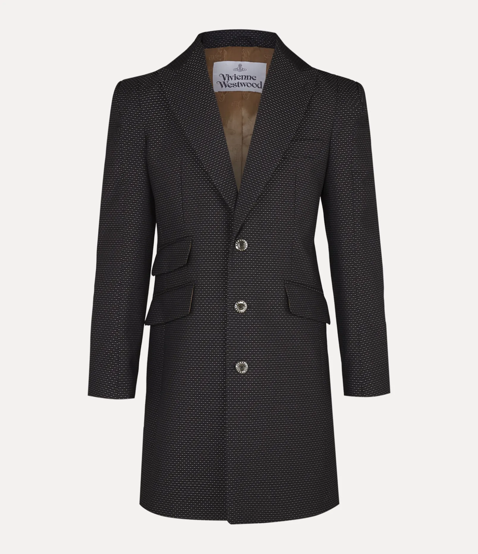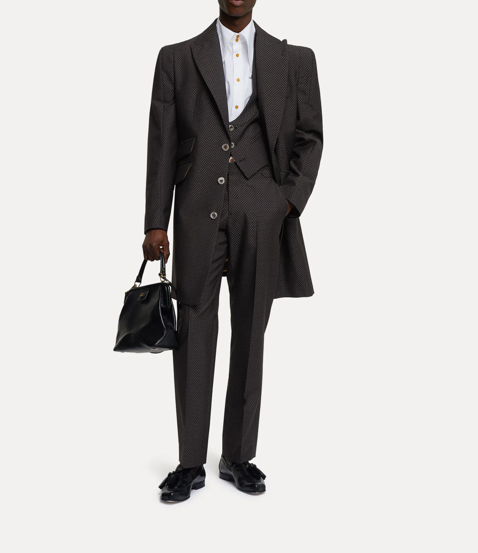 Our Alien three-button coat features Vivienne’s archival ‘Alien sleeve’ construction to add structure and size to the shoulders. The design receives this season’s ‘wool raindrop’ fabric, featuring small, elongated shapes scattered across the fabric, mimicking the appearance of falling raindrops.