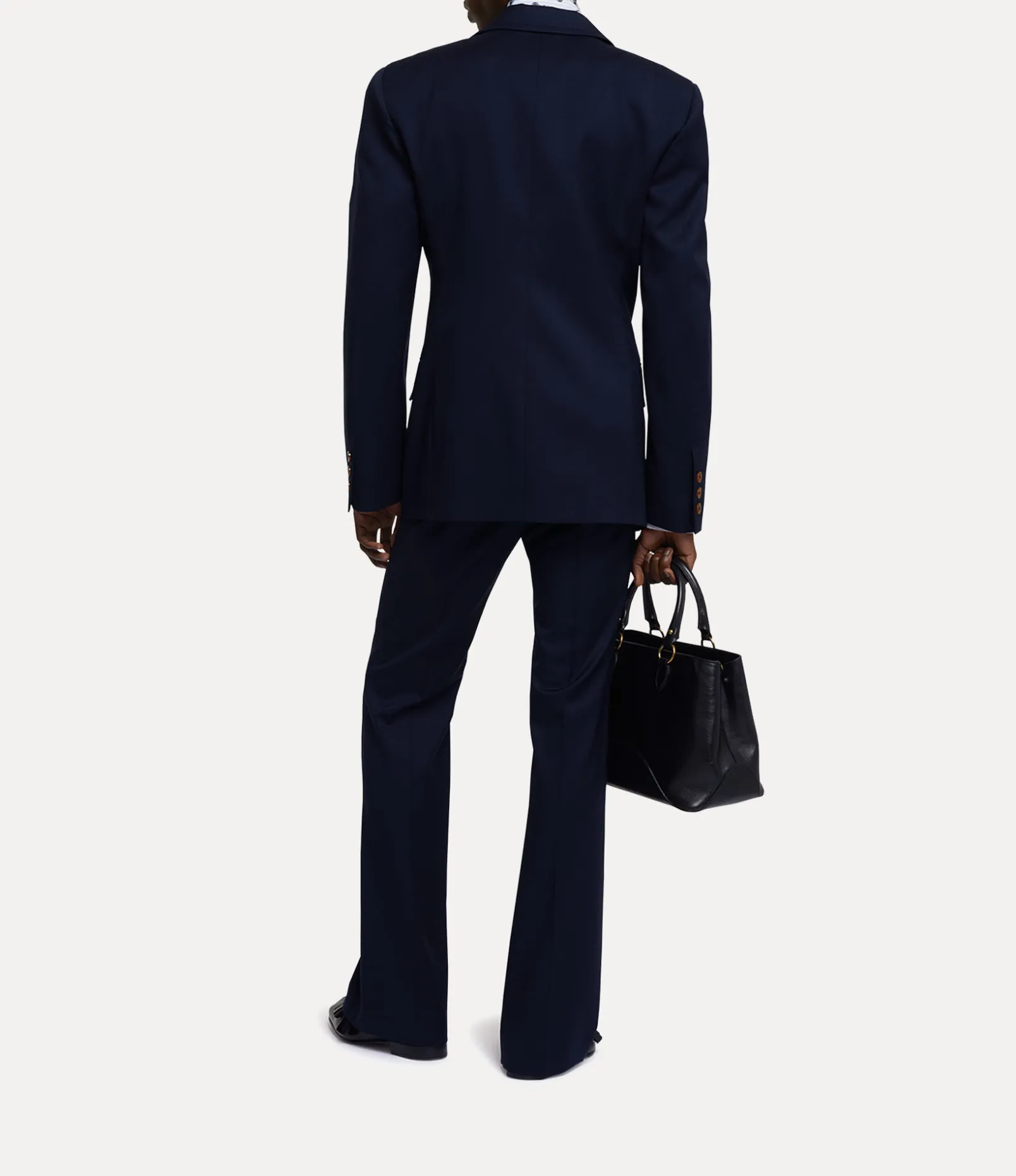 Our woollen Horseshoe jacket adopts a newly developed silhouette this season, featuring a U-shaped neckline with a double-breasted finish, complete with peaked lapels in a contrasting fabric. The piece receives an orb jacquard lining – synonymous with Vivienne’s vision of launching tradition into the future.