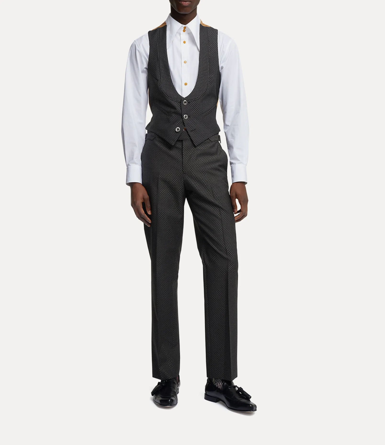Our Horseshoe waistcoat adopts a U-shape silhouette, complete with this season’s woven ‘Raindrops’ stitch – emulating the look and feel of raindrops on the woollen fabric. The design is reminiscent of classic English tailoring and features a contrasting orb jacquard silhouette to modernise the style.