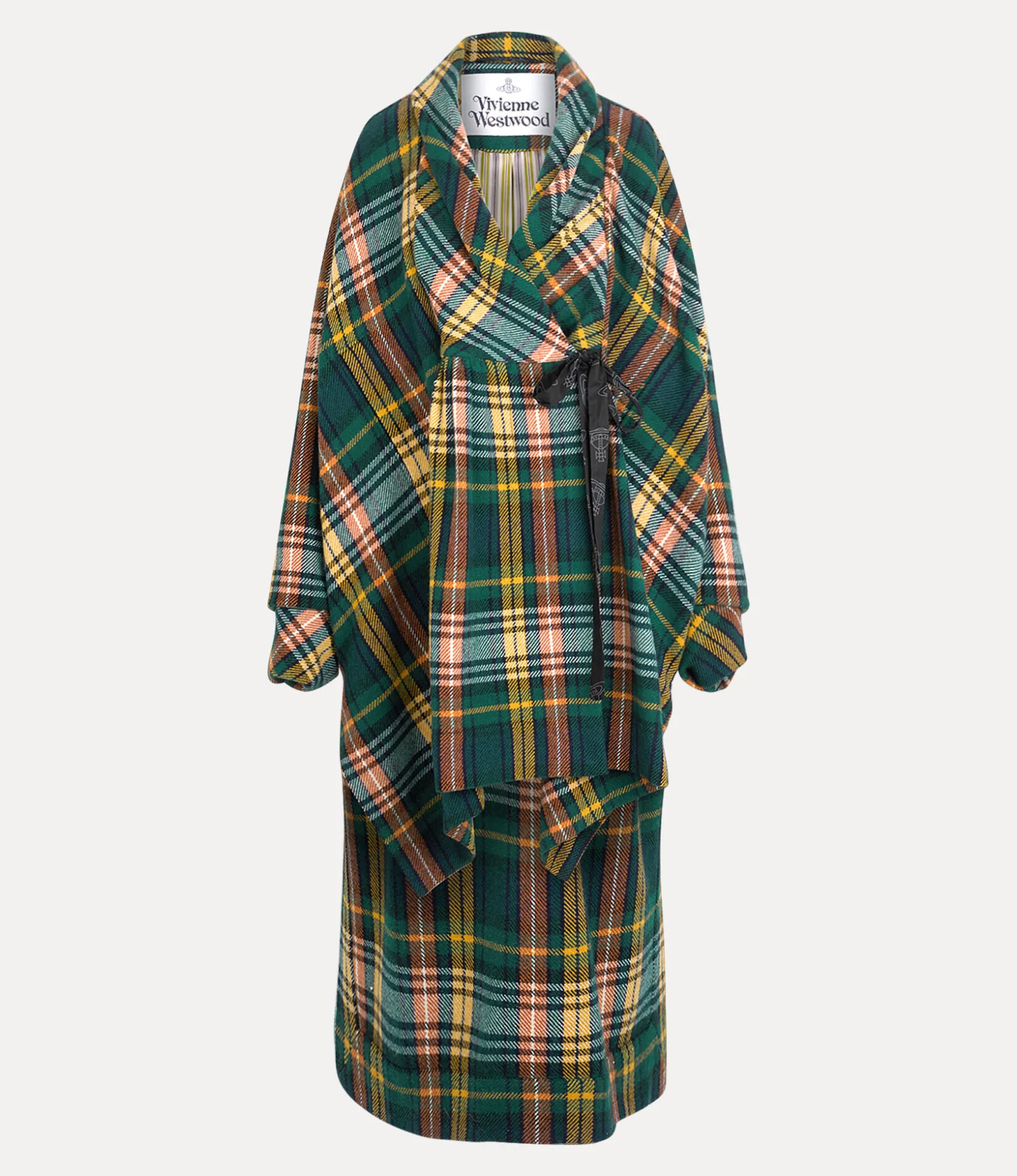 Our Karl coat features a woollen tartan motif woven across the design, reminiscent of an archival tartan fabric seen in the Vivienne Westwood Autumn-Winter 1993 ‘Anglomania’ collection. The piece adopts a partially lined interior with contrasting stripes, artfully clashing with the tartan exterior to reflect this season’s Highland inspiration.