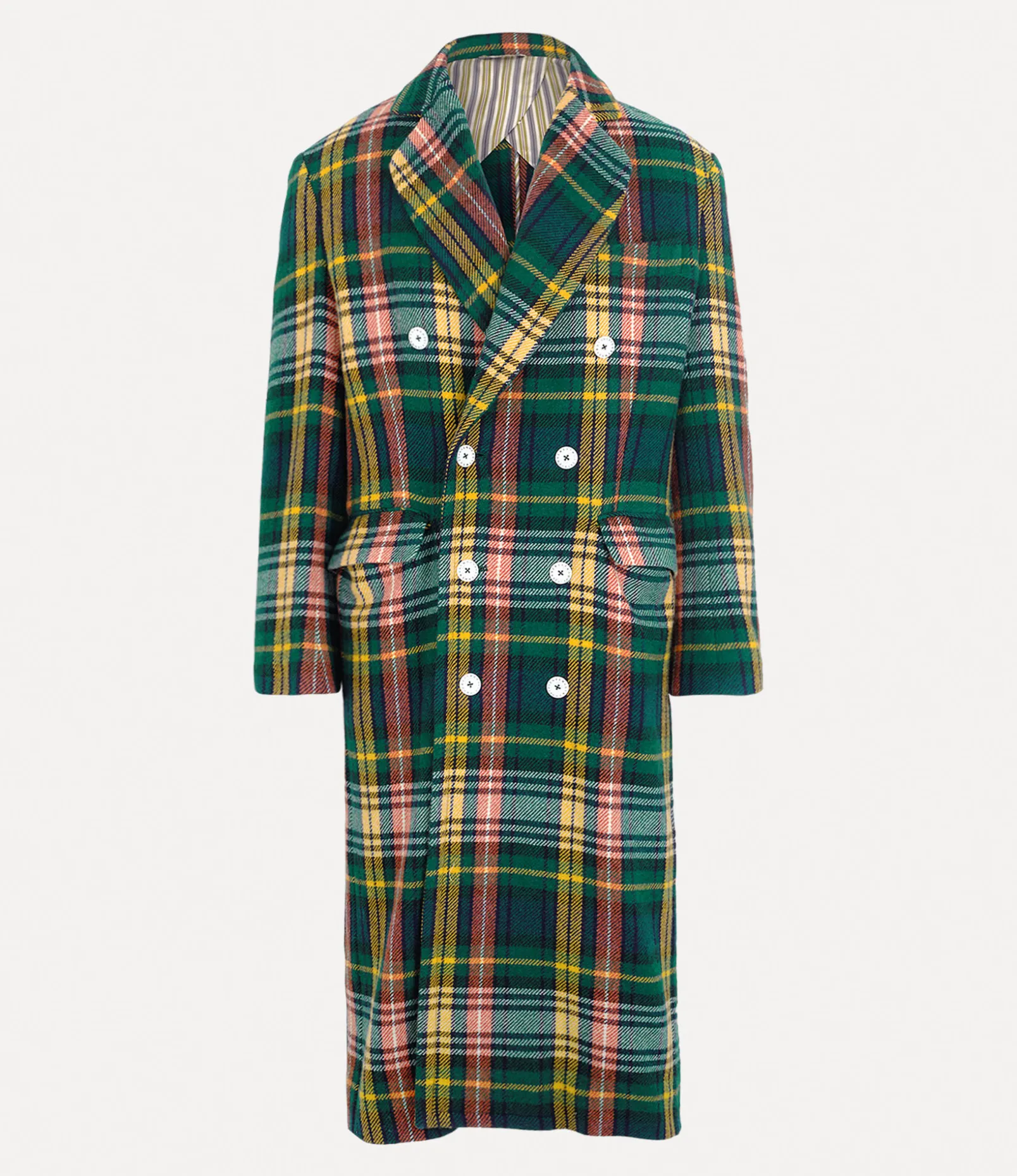 The Man Long Wreck coat, with its double-breasted design, has become a signature style for the house and has been featured in numerous collections over the years. This season, the coat is embellished with a woolen tartan pattern woven into the fabric, reminiscent of a tartan fabric from the Vivienne Westwood Autumn-Winter 1993 ‘Anglomania’ collection.