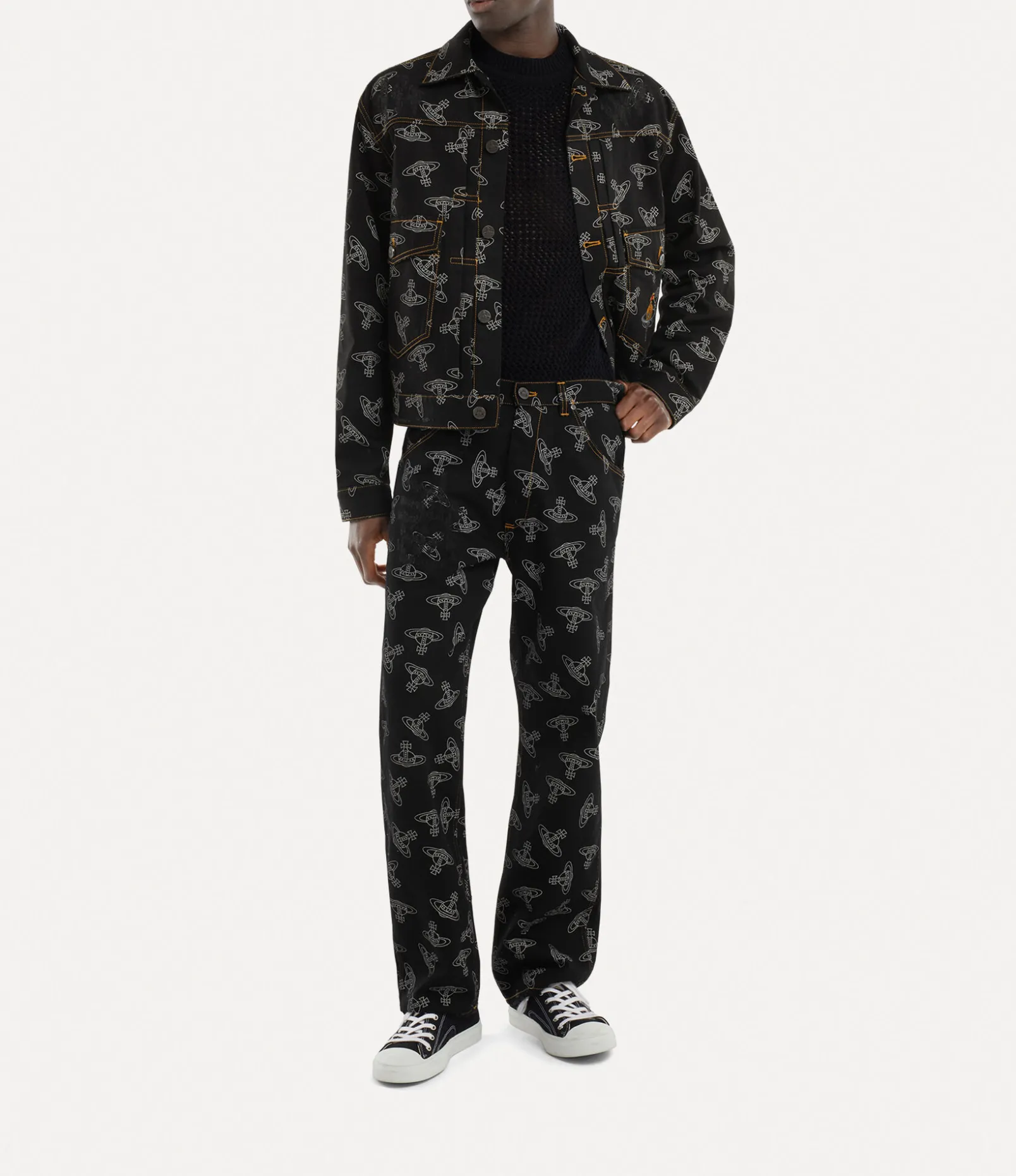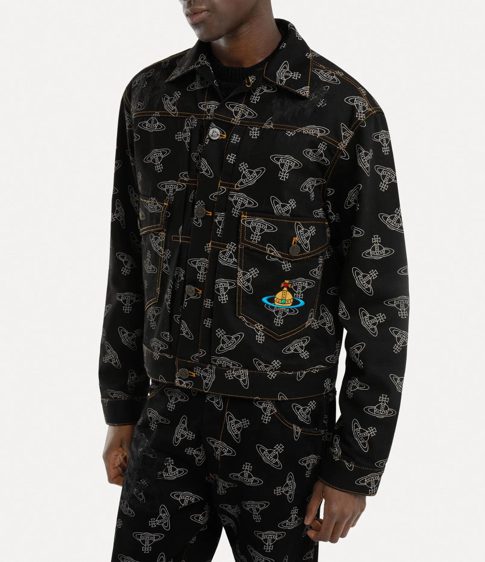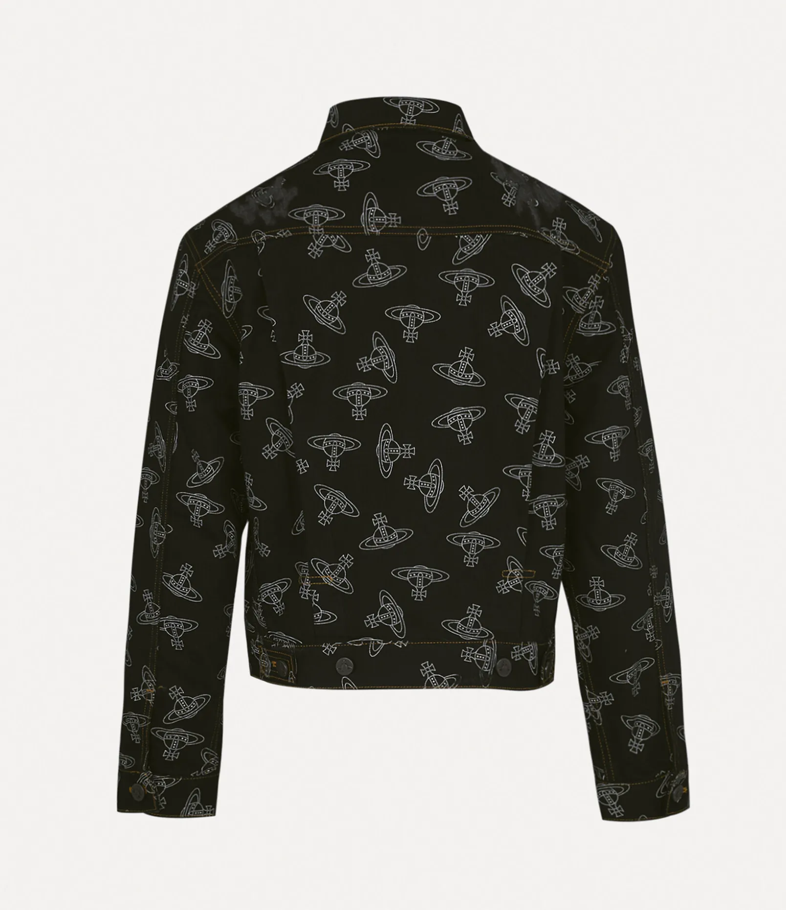 Our signature Marlene jacket receives the house’s ‘Tossed Orb’ jacquard across the design, showcasing a repeated orb pattern in a contrasting white-coloured finish. The piece features a multicoloured orb embroidered on the front pocket, synonymous with Vivienne’s vision of taking tradition into the future.