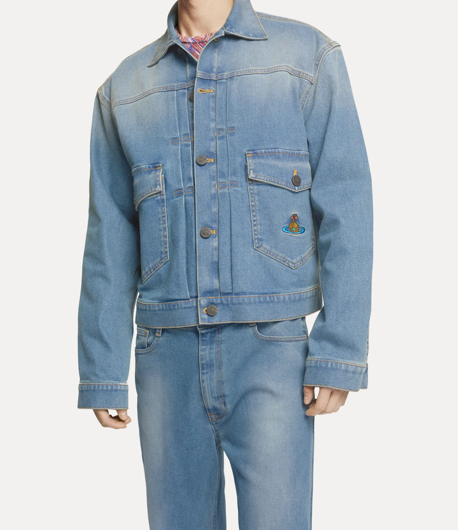 Our signature Marlene jacket features a soft denim silhouette, complete with contrasting topstitching in a classic tan thread. As part of our new range, the piece offers new branding, showcased by the orb-engraved buttons and an enlarged orb embroidery on the front pocket – synonymous with Vivienne’s vision of taking tradition into the future.