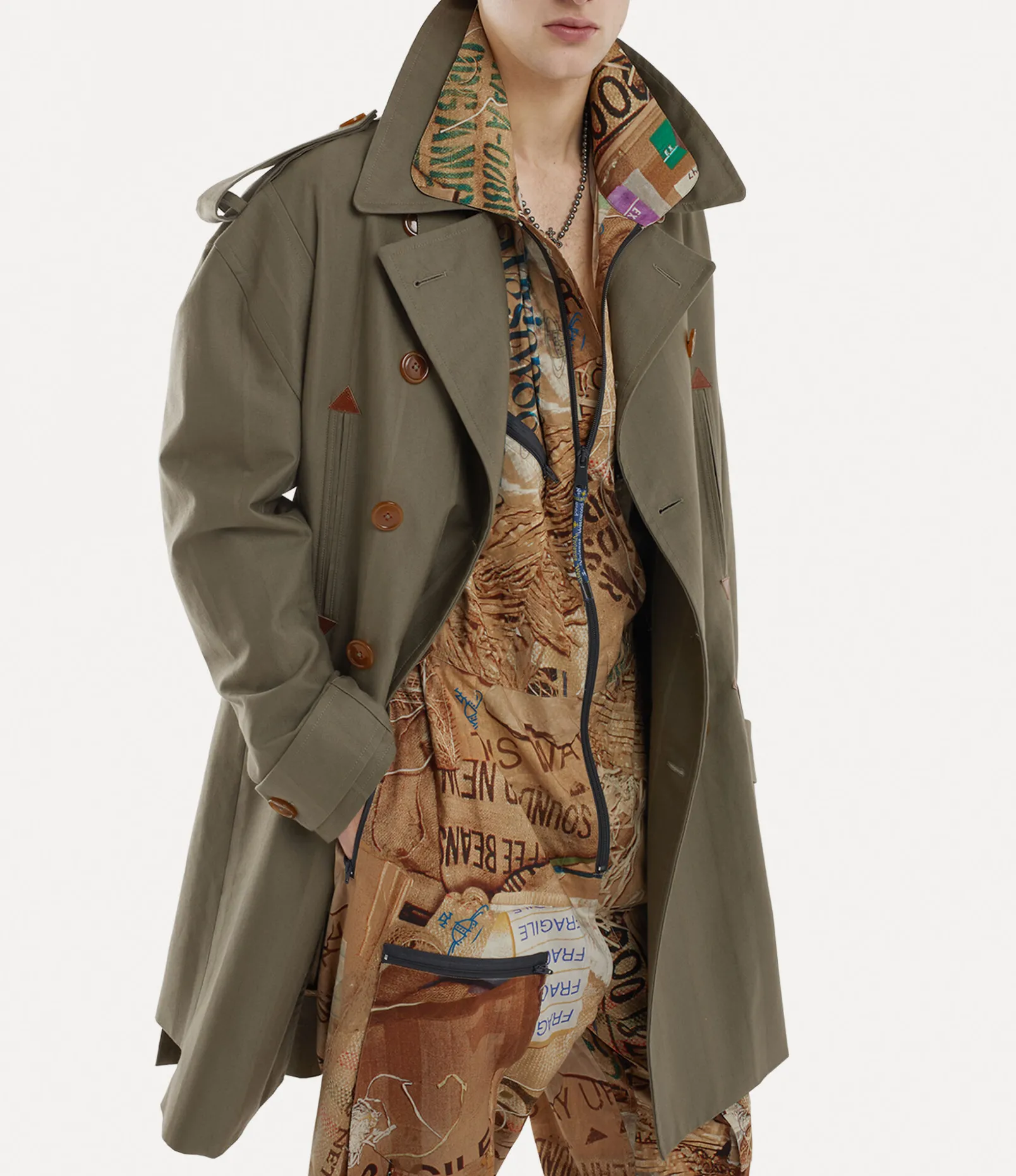 Our Stripped Trench coat features a soft cotton silhouette, complete with this season’s ‘Drunken Herringbone’ motif. The piece receives a double-breasted design with button-fastening epaulettes, finished with the ‘Rubbish’ motif printed along the interior lining – evoking the concept of upcycling newspapers by using them to wrap valuable ornaments when moving.