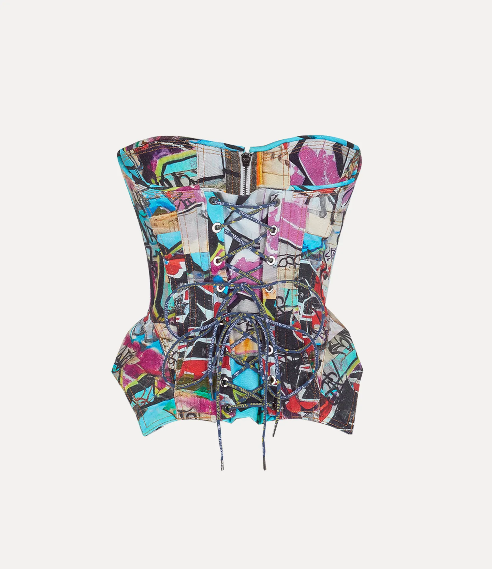 The silhouette of the Denim Cobrax corset reveals how Vivienne originally subverted the classic corset structure, worn by high society women of eighteenth-century salon culture. The design revives our archival graffiti jacquard, first seen in the Vivienne Westwood Autumn-Winter 2020-21 Paris show, reminiscent of the house’s signature punk style.