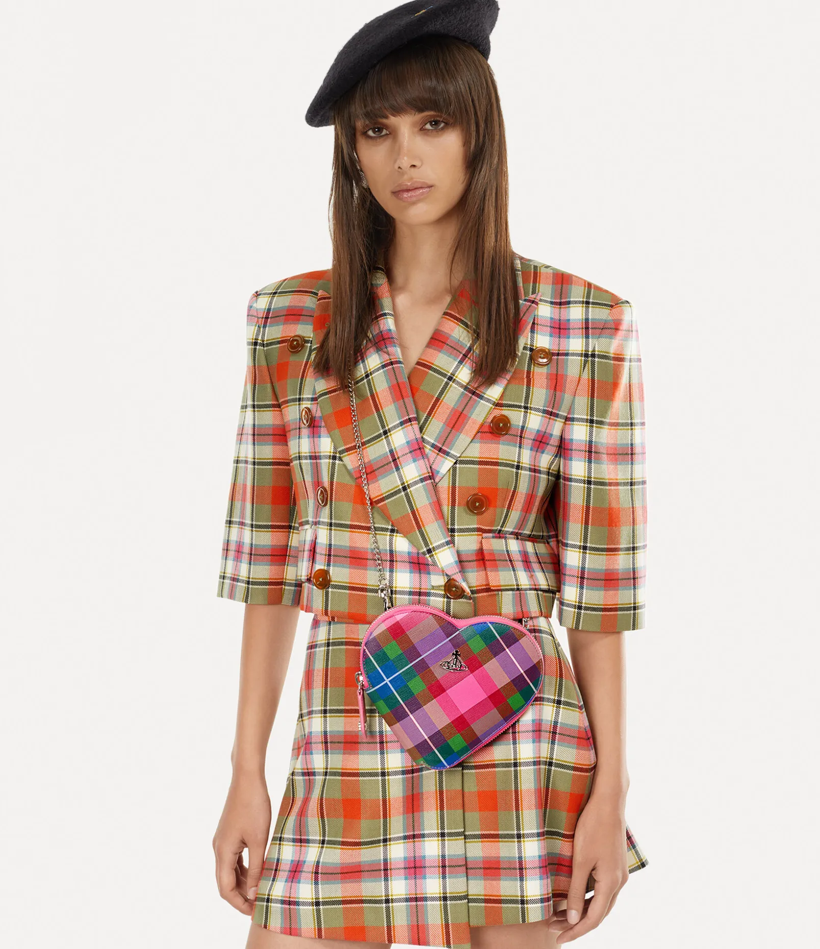 The heart shape has become a signature style of the house, having appeared in many collections throughout our history, from political prints to cherished artworks. The silhouette of the Heart Crossbody bag revives the motif, complete with our ‘candy tartan’ across the design – a playful, candy-toned pattern that evokes the wild beauty of the Scottish Highlands, which inspires this season’s collection.
