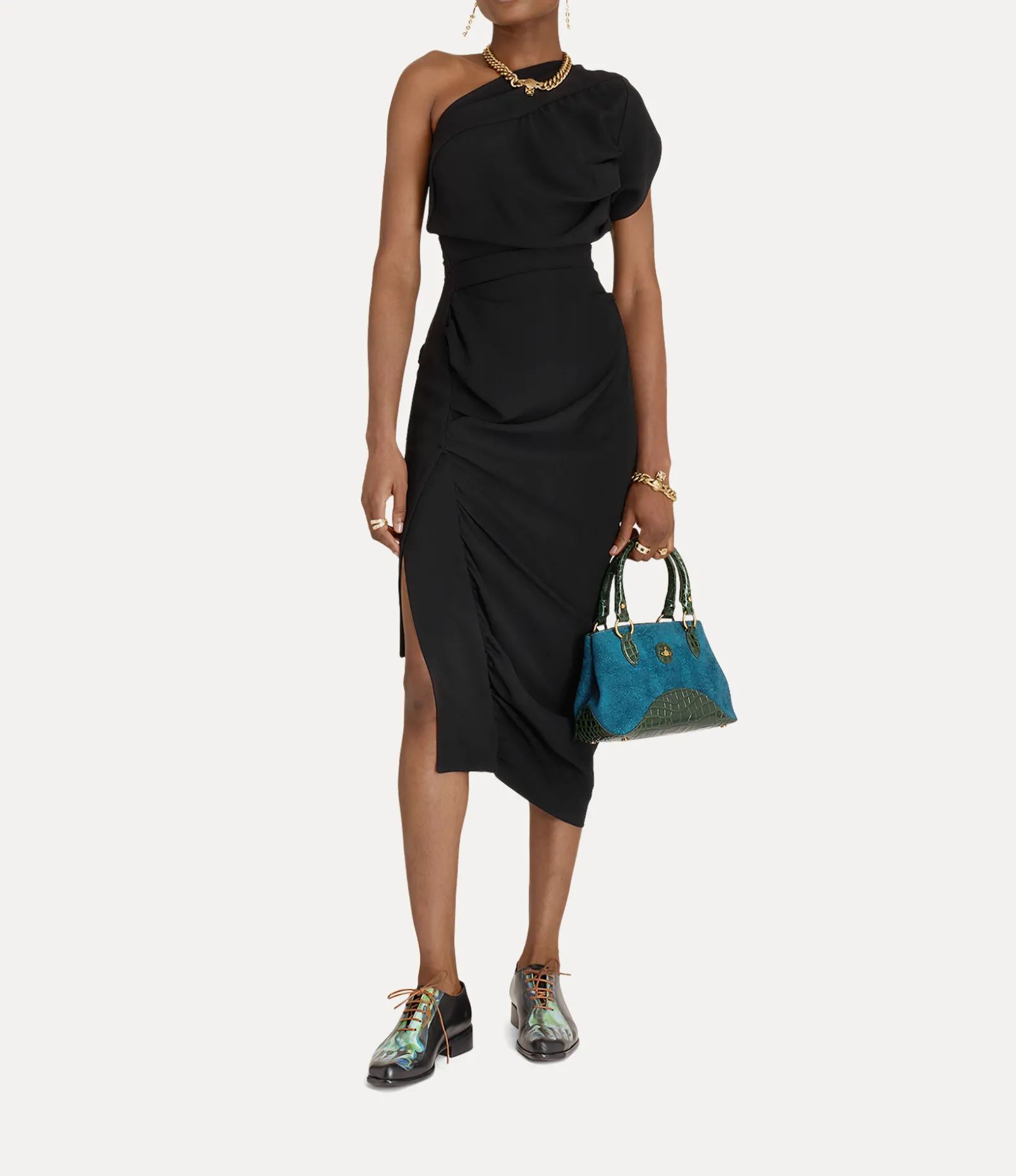 First showcased in our Autumn-Winter 1982-1983 ‘Savage’ collection, the Andalouse dress returns this season in a lightweight viscose fabric. This statement piece is complete with draping details that fall into an asymmetric finish, paying tribute to the renowned tailoring techniques of Vivienne Westwood.
