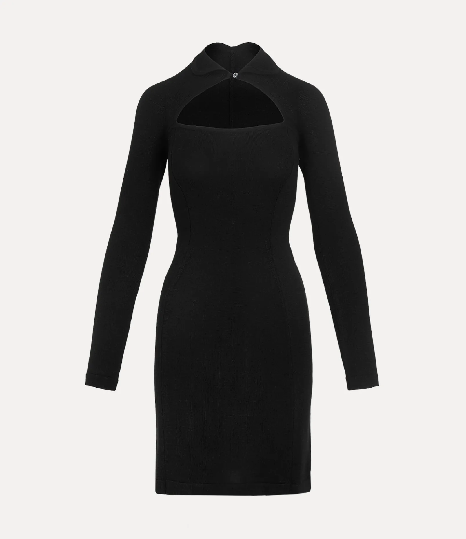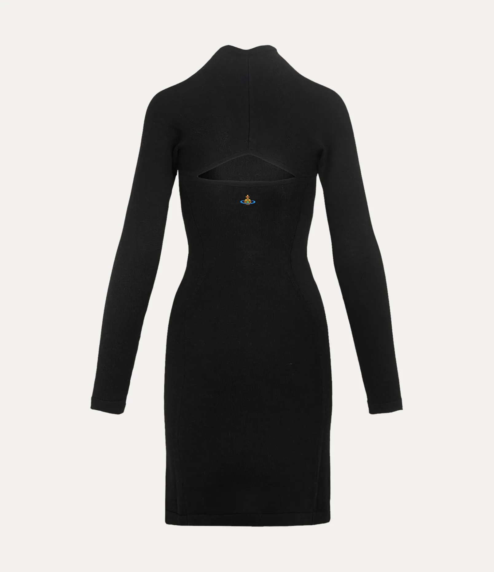 Our Pamela dress features a woollen silhouette with a horizontal slit above the chest, recalling the tailoring system used in our Spring-Summer 1991 ‘Cut, Slash and Pull’ collection. As part of our new range, the piece receives a mother-of-pearl button on the collar, complete with an embroidered orb at the back – synonymous with Vivienne’s vision of launching tradition into the future.