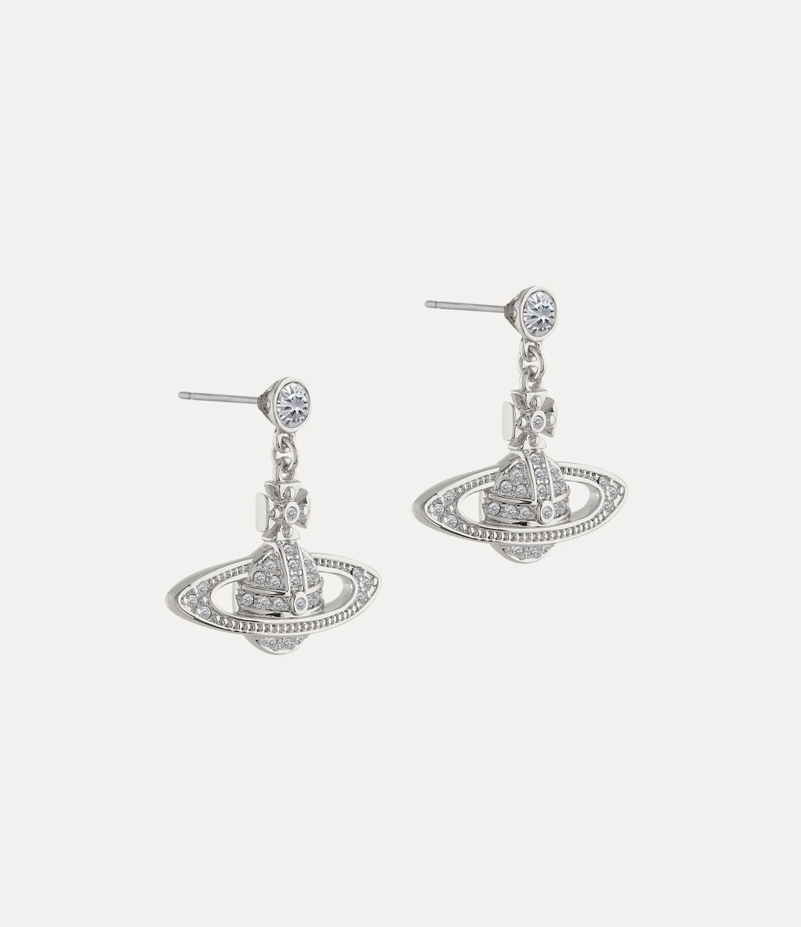 The orb silhouette has long been synonymous with the house, recalling Vivienne’s vision of launching tradition into the future. The Mini Bas Relief Drop earrings receive an orb shape, complete with polished platinum-tone plating and white crystal details to finish.
