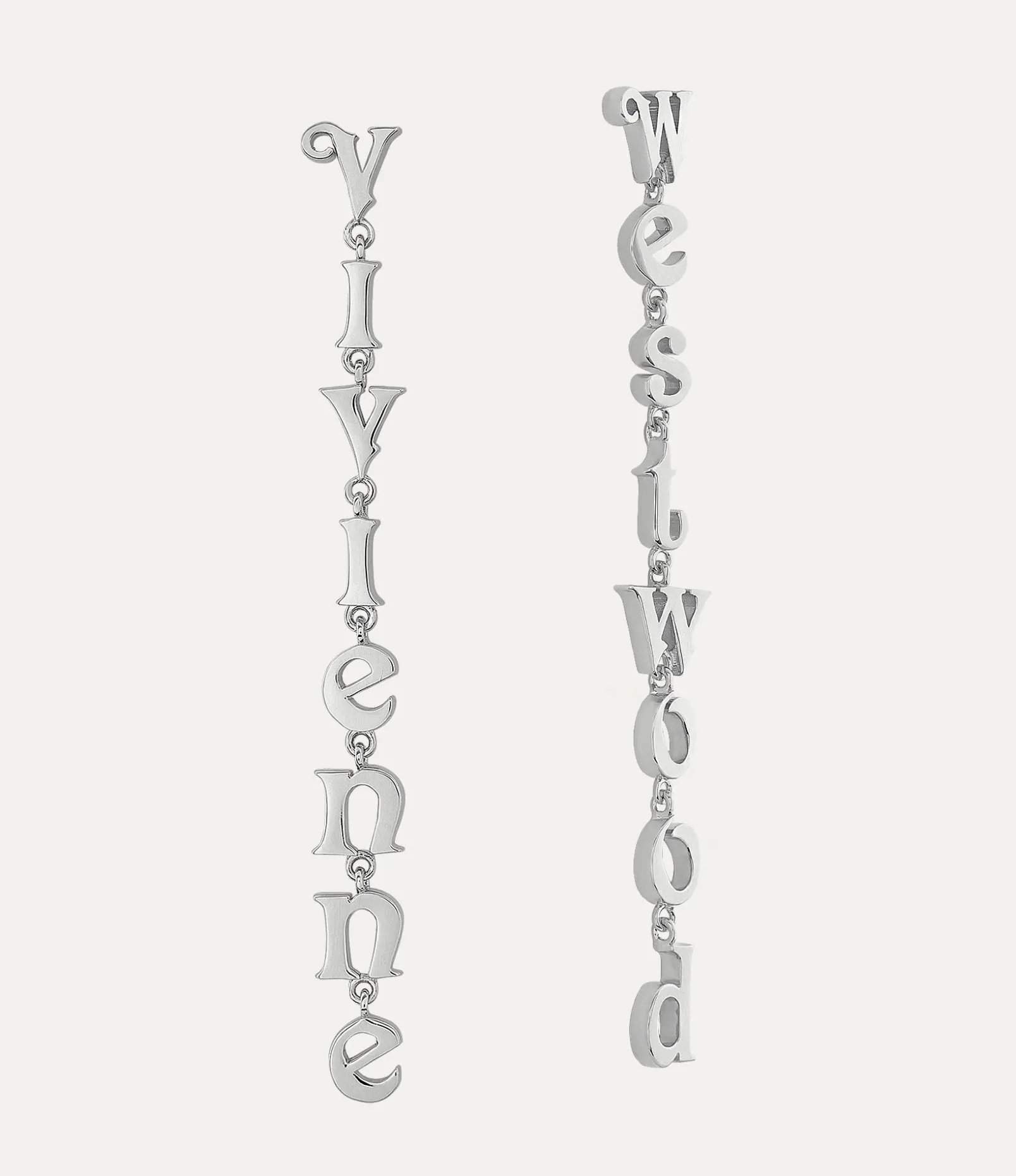 The asymmetric Raimunda earrings showcase the words ‘Vivienne’ and ‘Westwood’ sculpted in our classic lettering, enhanced by silver-toned plating. Dangling gracefully from the lobe, these earrings are secured with a post-back closure and feature a drop silhouette.