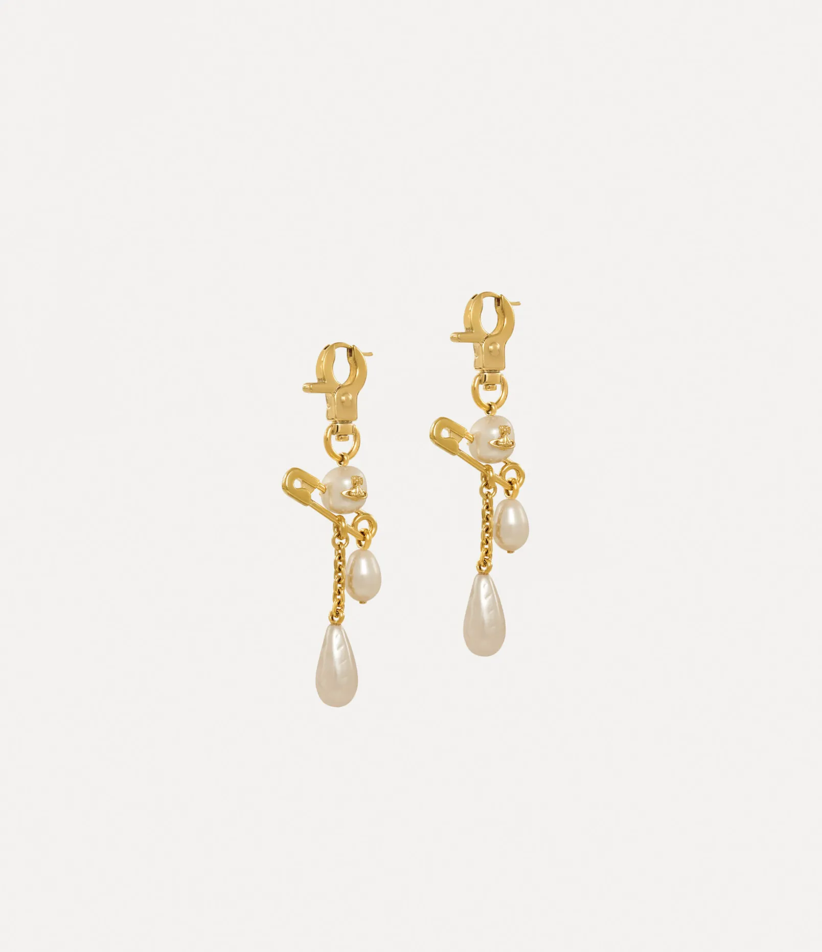 Crafted with gold-tone plating, the Claude Long earrings showcase a rounded pearl with a central orb, accented by a signature safety pin detail – a nod to Vivienne’s punk-inspired, non-conformist aesthetic. With a drop silhouette, these earrings are finished with a hardware-inspired clasp and a hinged post for easy closure.