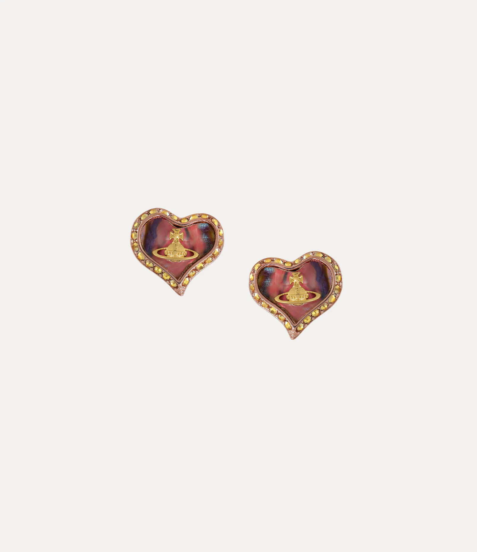 The asymmetric heart shape has become a signature style of the house, which Vivienne used to evoke affection for both humanity and the planet. Our Petra earrings adopt a red heart silhouette, adorned with yellow-coloured crystals and a gold-tone orb motif – synonymous with our house’s vision of launching tradition into the future.