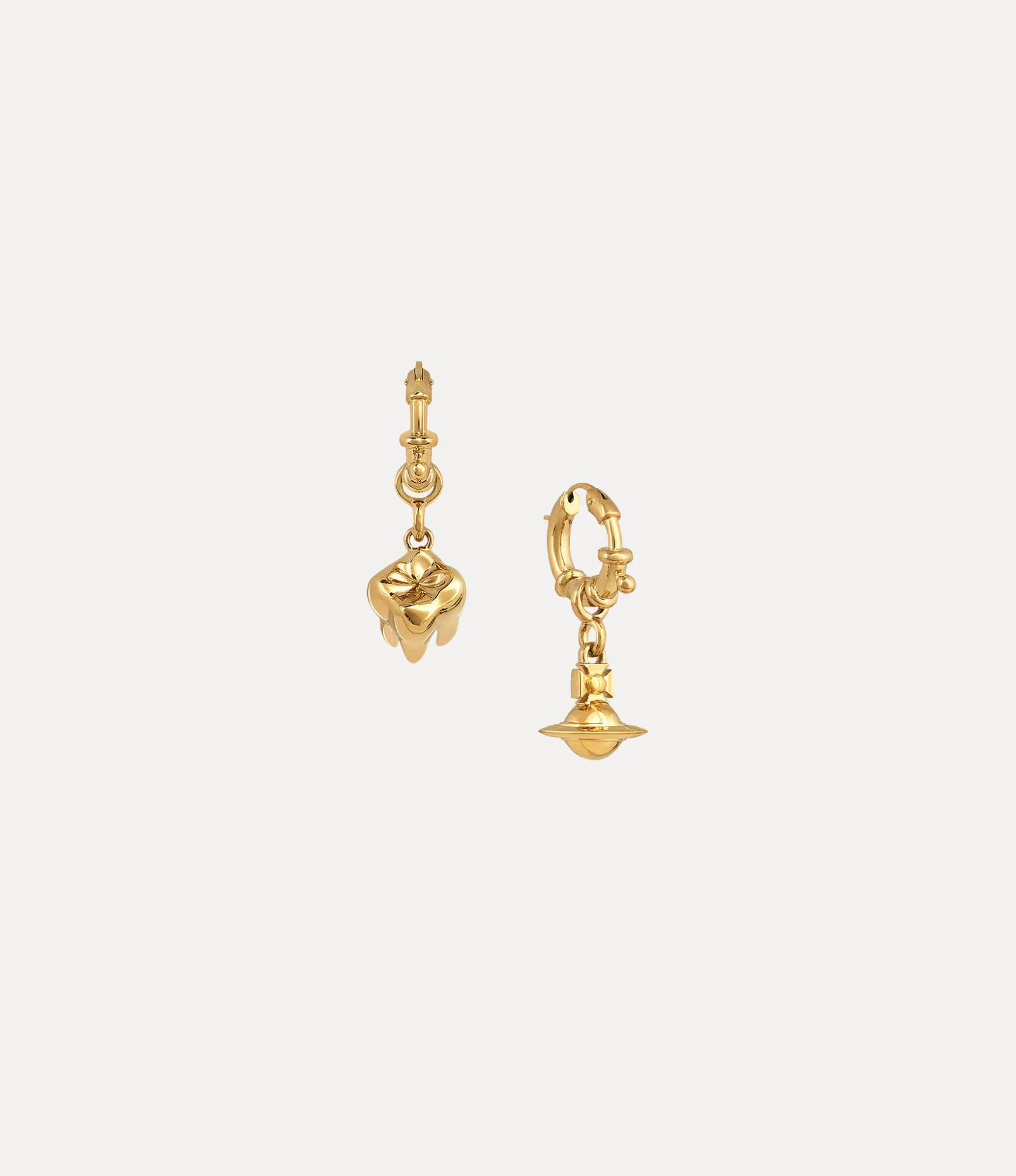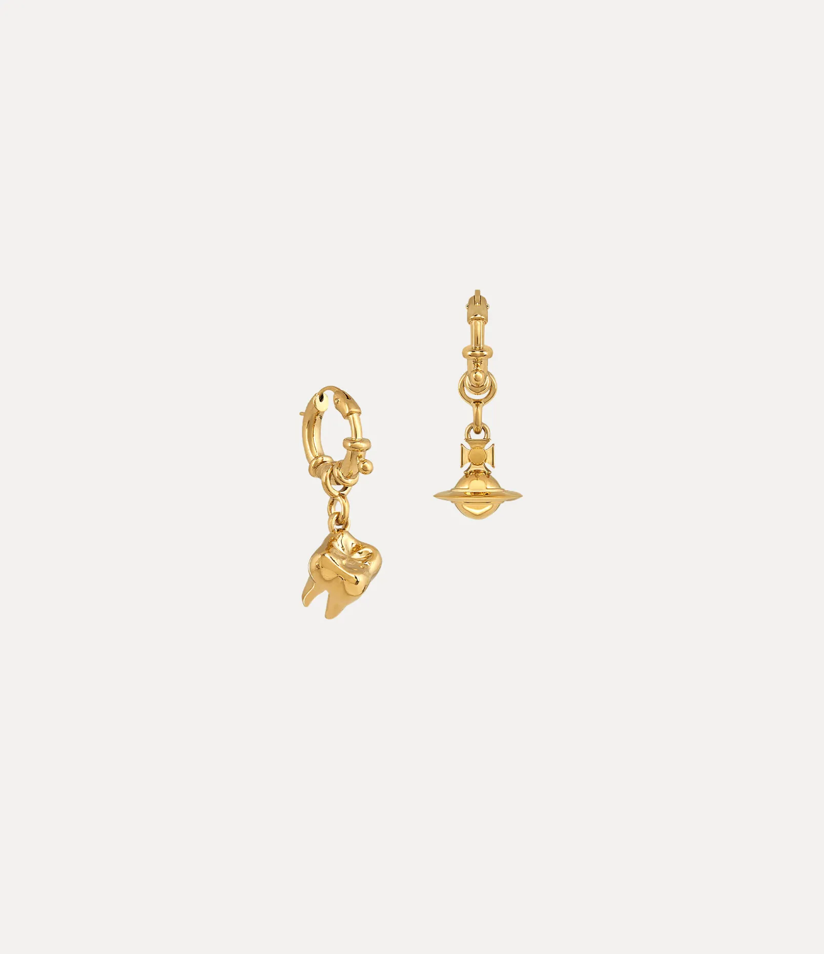 The Rima earrings showcase an asymmetric design, complete with a gold-tone plated finish. The piece features an all-metal dangle orb, which symbolises Vivienne’s vision for taking tradition into the future, along with the archival tooth motif, paying homage to our long-standing tradition of teeth-inspired jewellery, first introduced in the iconic Spring-Summer 1997 ‘Vive La Bagatelle’ collection.