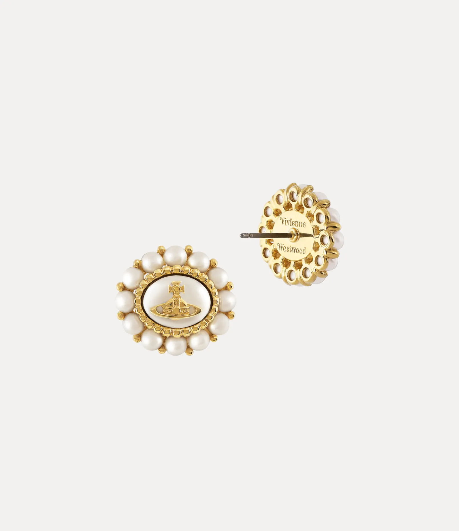 Pearls are an essential part of our house’s heritage, emulating a sense of bygone luxury. The Small Amaya earrings adopt a halo of glass-based pearls in a glistening white finish, complete with gold-tone brass plating. The piece receives an orb plaque in the centre of the design, a symbol of Vivienne’s vision of launching tradition into the future.