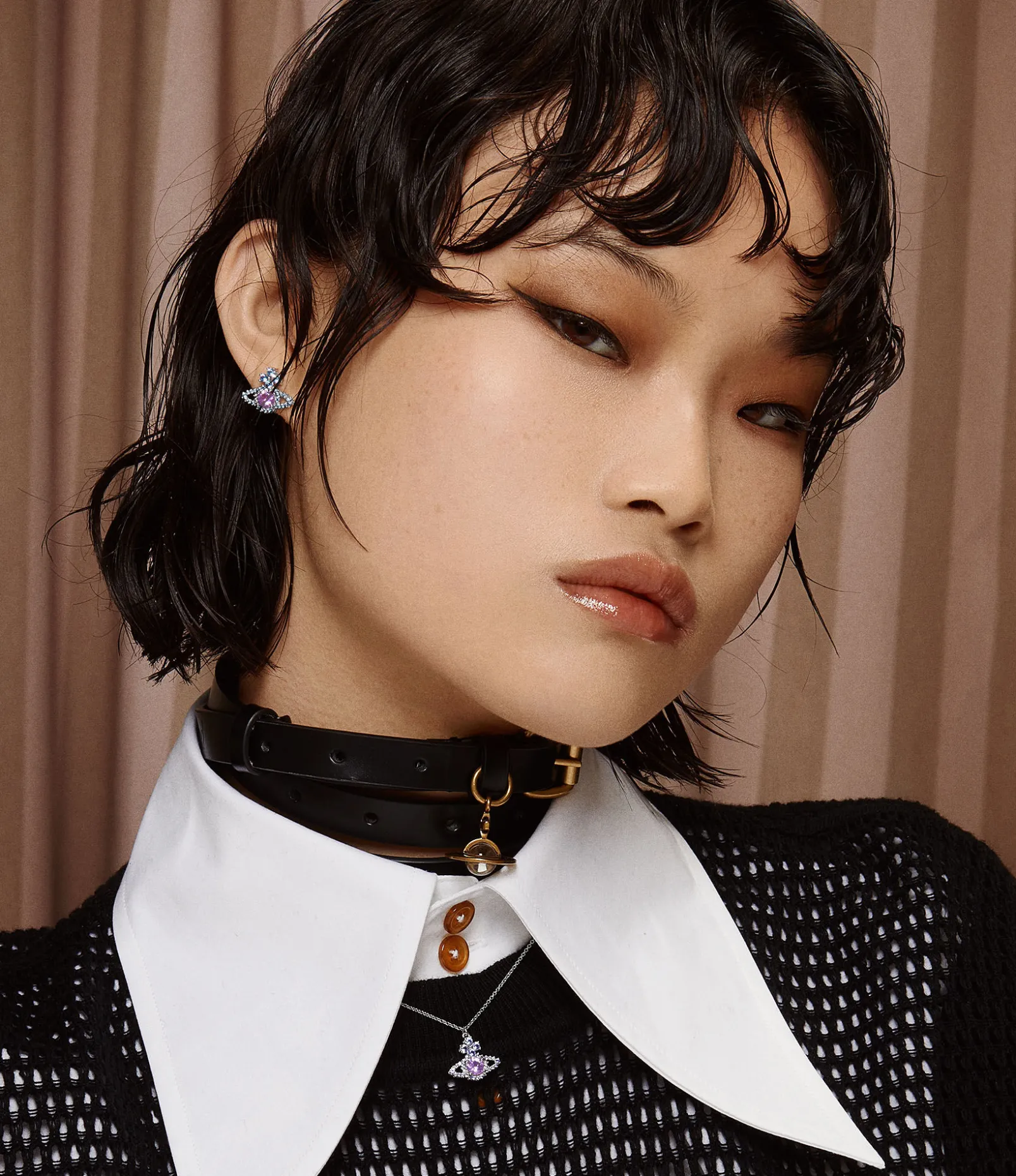 The orb has become a signature motif of the house, synonymous with Vivienne’s vision of taking tradition into the future. The Valentina Orb earrings receive this silhouette, complete with polished silver-tone plating and coloured gemstone embellishments.
