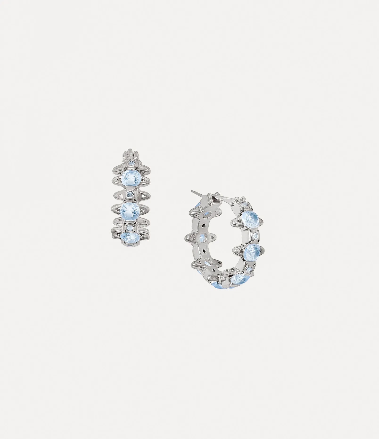 Our Warwick earrings feature a metal silhouette with a silver-tone plating, adorned with glistening crystal details. The piece adopts a hoop shape that connects multiple orb motifs, synonymous with Vivienne’s vision of launching tradition into the future.