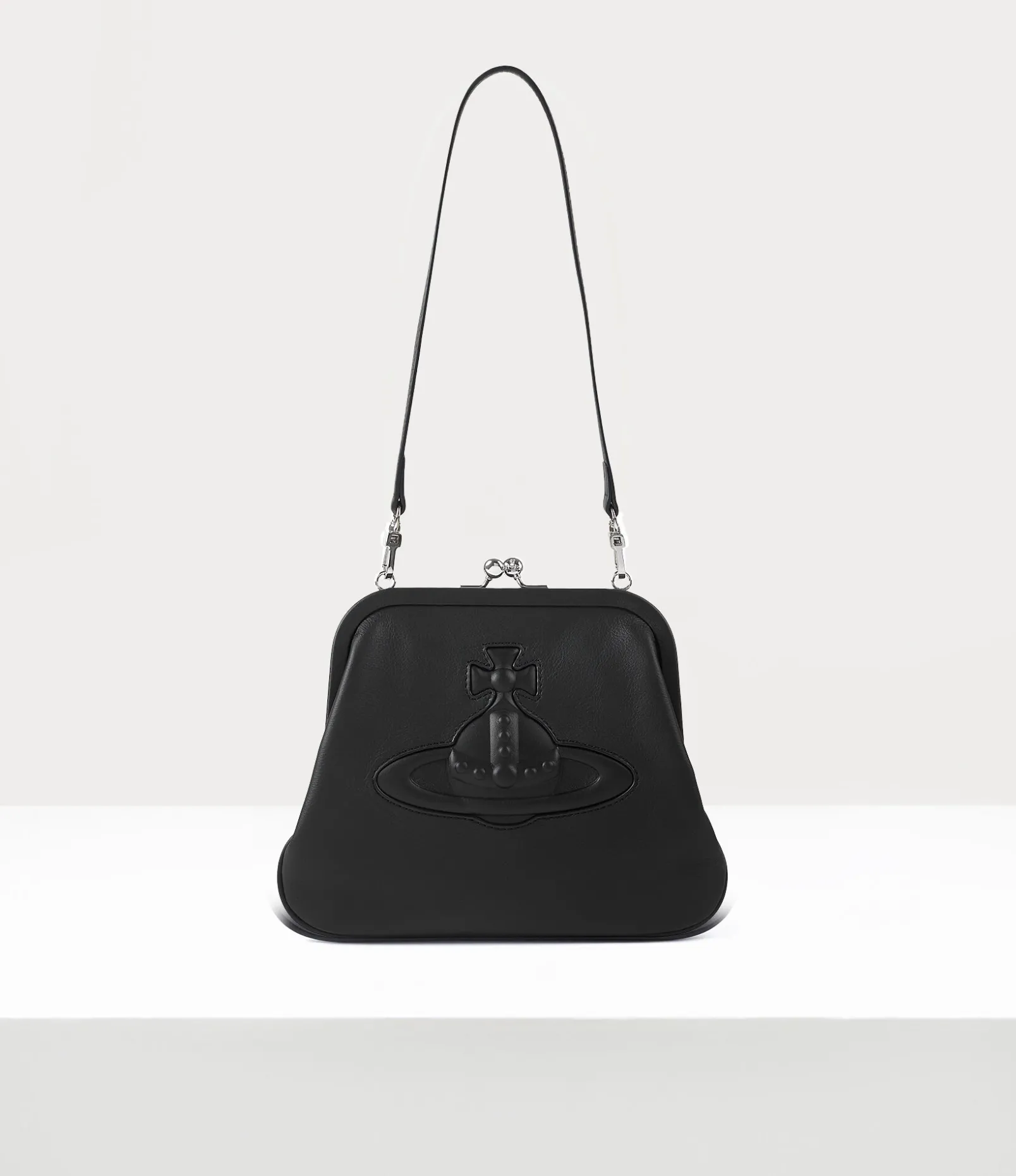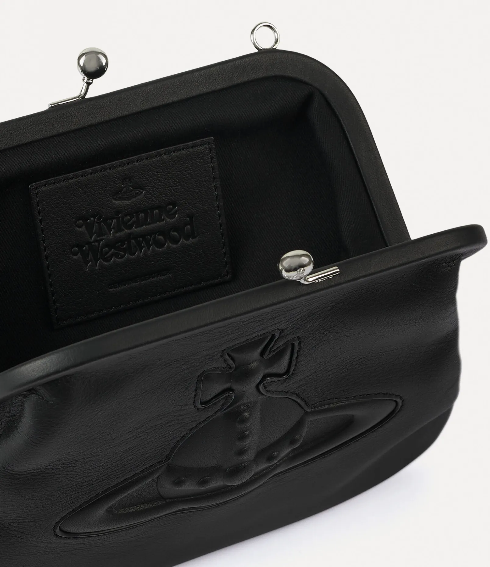 The Vivienne’s clutch in smooth leather pays homage to the houses founder. This classic style features a vintage-like kiss-lock frame and injected orb on the front panel, inspired by Vivienne Westwood’s orb-shaped logo, a symbol for launching tradition into the future.
