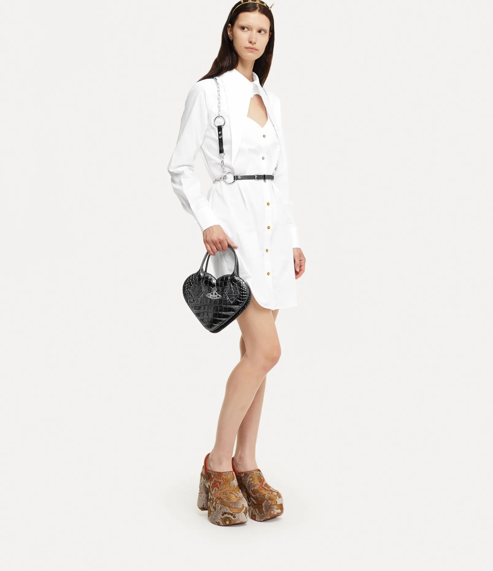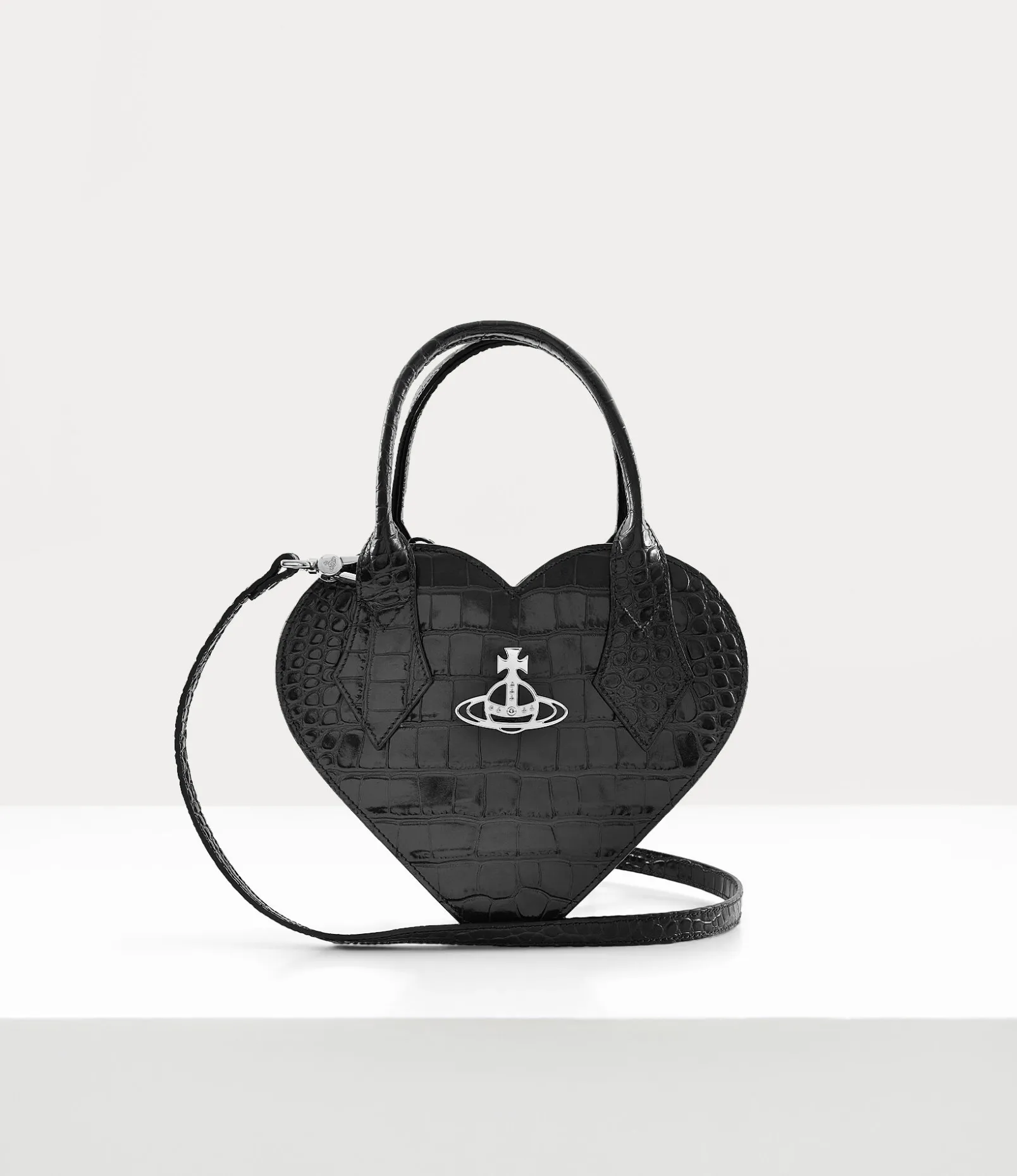 The silhouette of the Josephine Heart Crossbody bag revives the house’s signature heart-shaped motif. The piece features a croc-embossed leather finish, complete with a single-compartment design that closes with a zip-around fastening. Our house’s orb emblem is offered on the front panel – synonymous with Vivienne’s vision of launching tradition into the future.