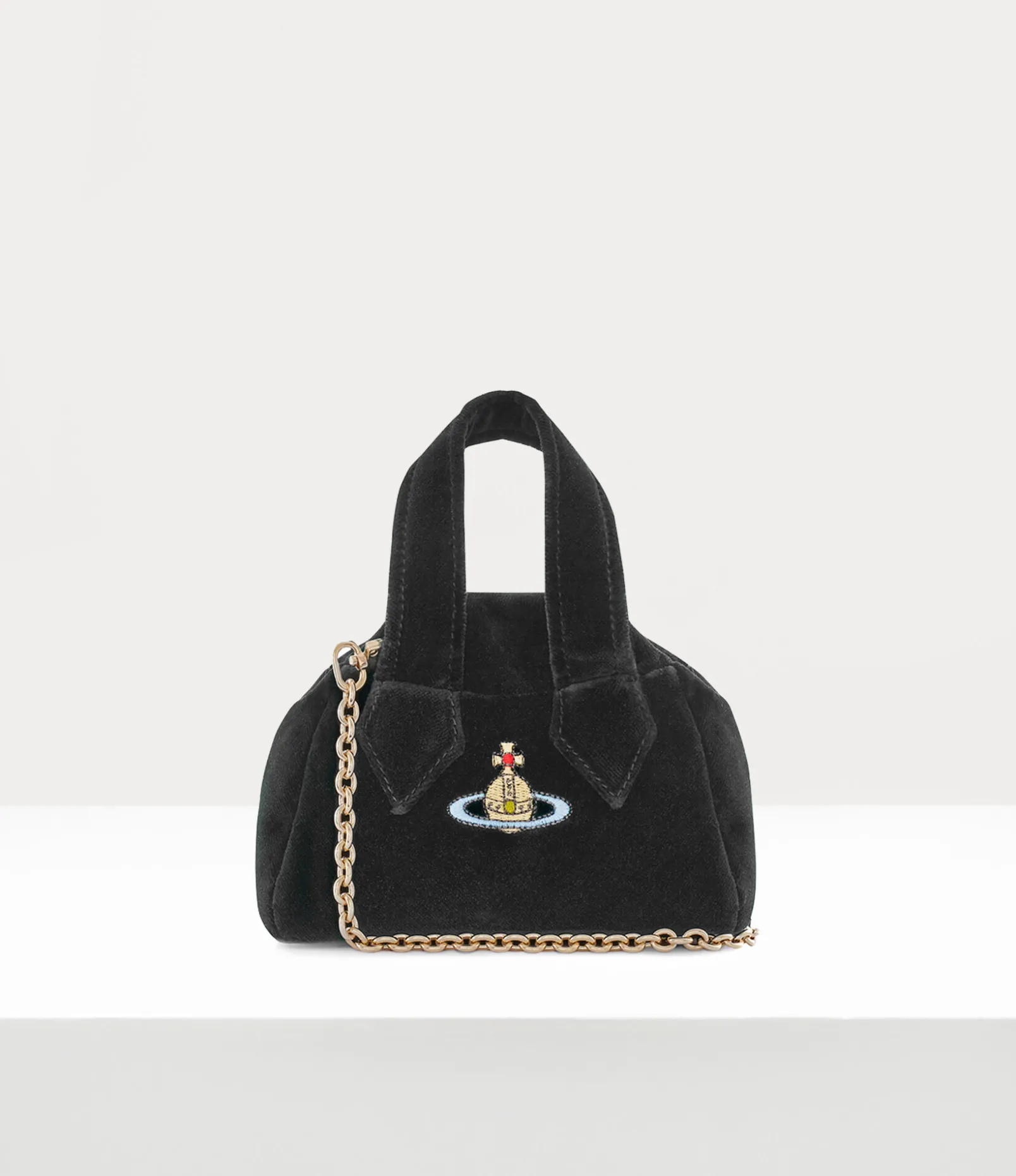 Our iconic Archive Mini Yasmine handbag, a new development of the house’s classic Yasmine style, was first presented at the Gold Label Autumn-Winter 1987/88 ‘Time Machine’ runway show. Named after the French designer Yasmine Eslami, who worked for Vivienne Westwood in the late ‘80s, the bag features a faded ‘Union Jack’ interior lining and cotton-velvet exterior panels, reflecting the opulent Neo-classical theme of this season.