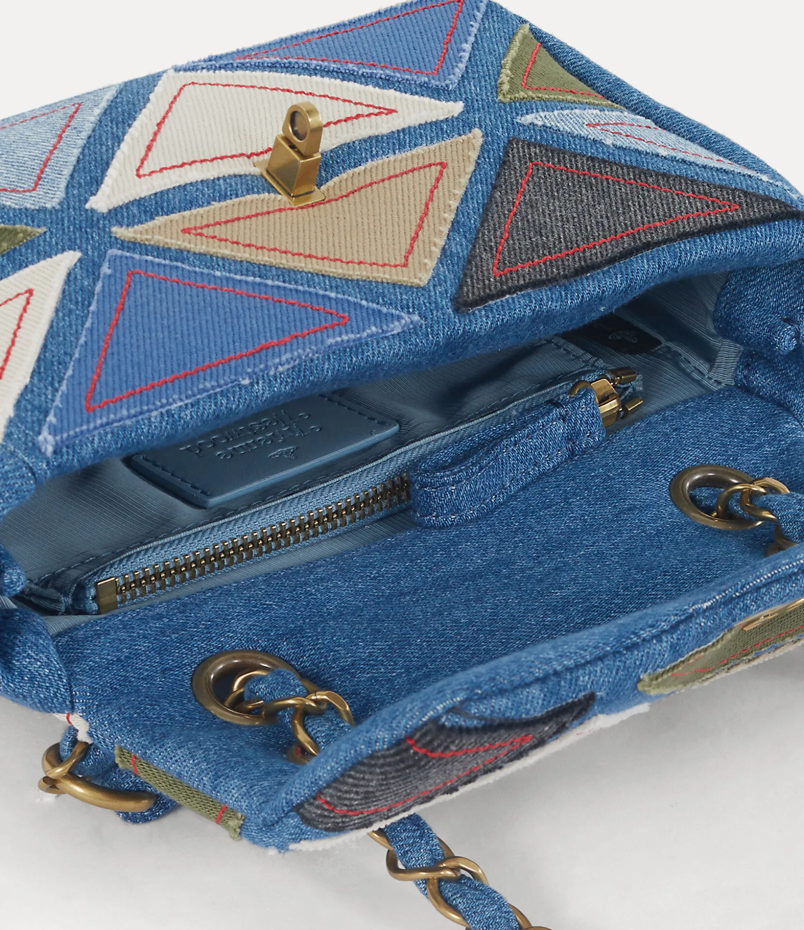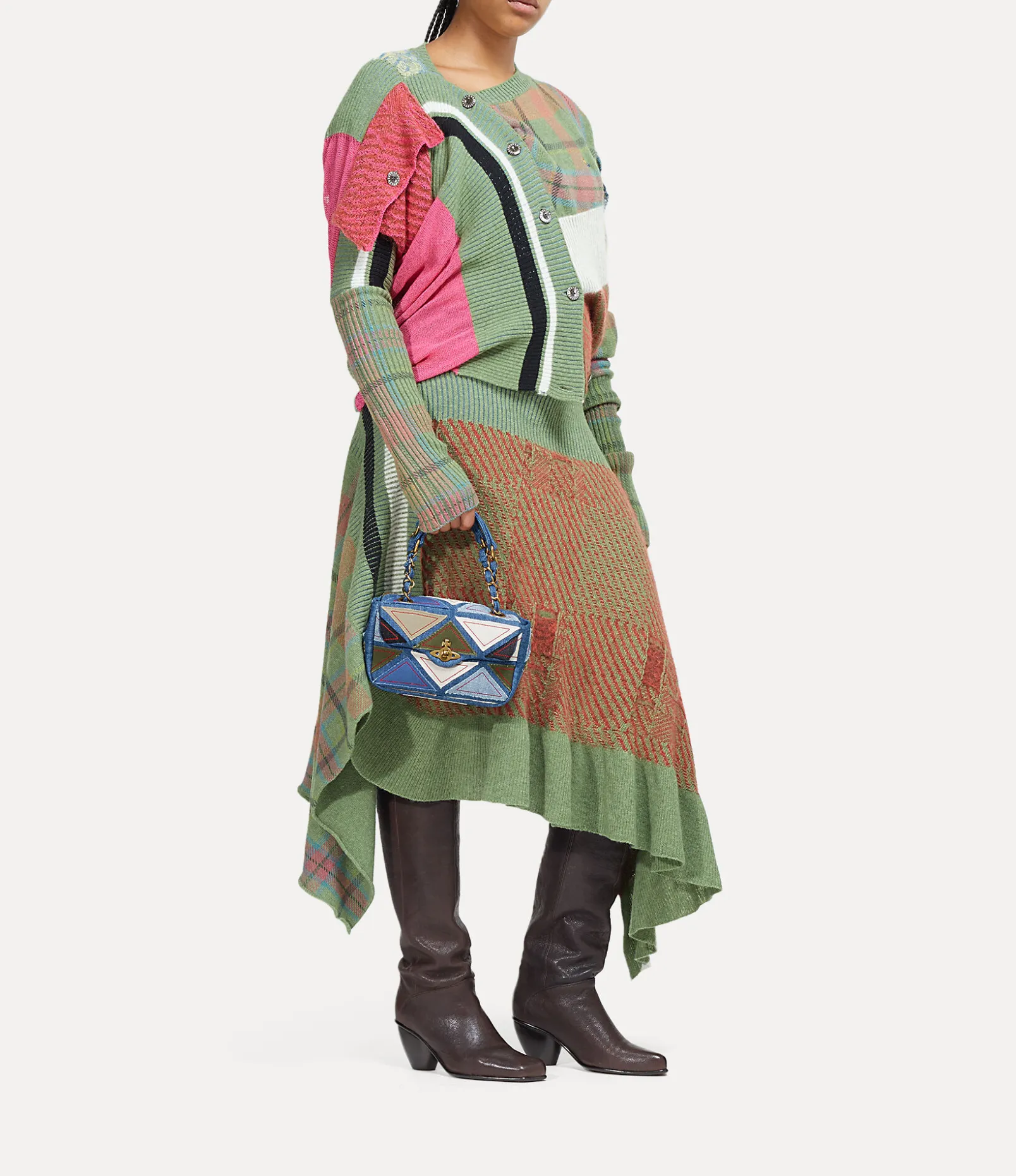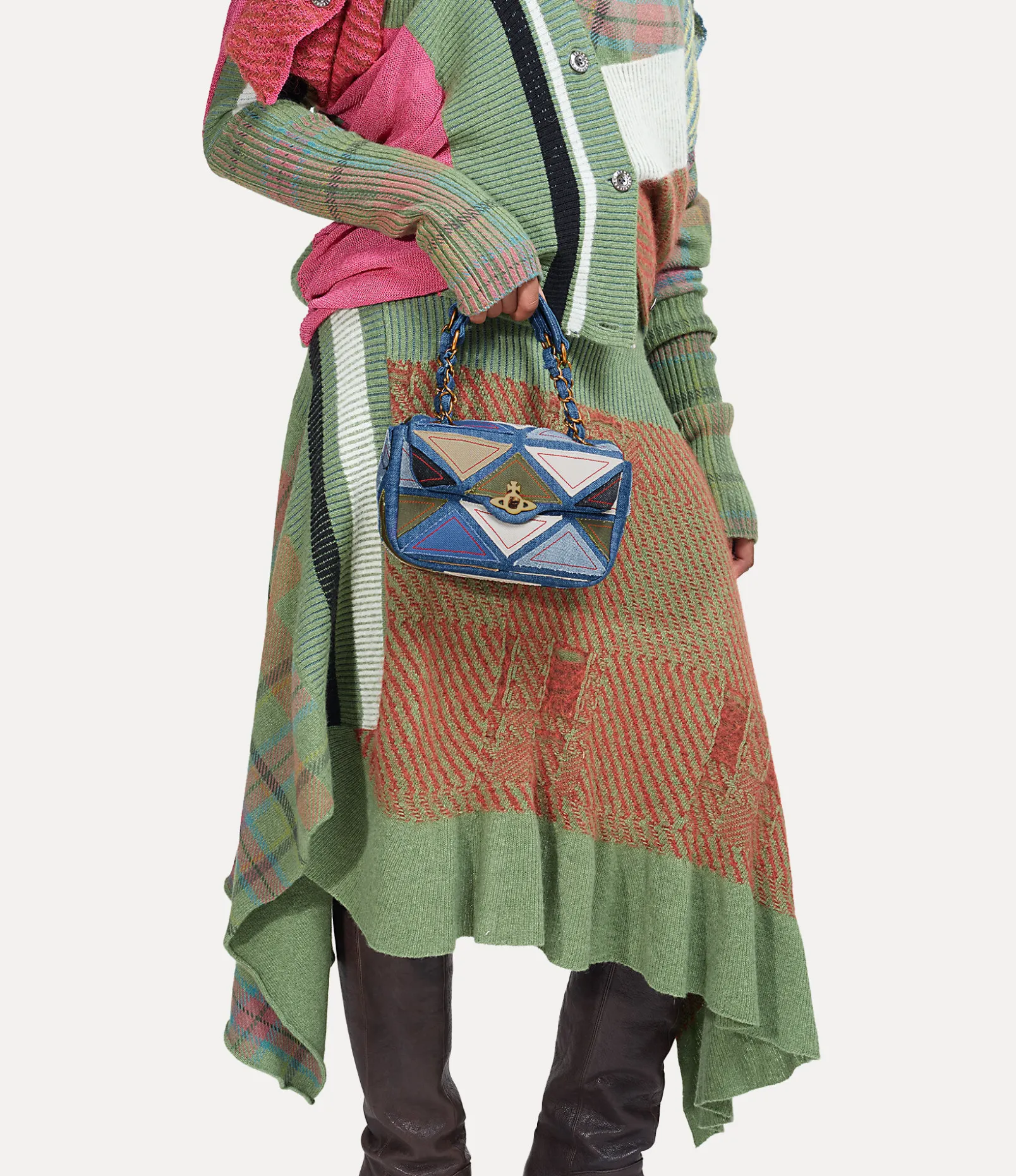 Our Anita Chain Shoulder bag first featured in the Andreas Kronthaler Spring-Summer 2024 show. This season, the piece receives a soft cotton denim silhouette, complete with a ‘Harlequin’ patchwork finish – recalling our Autumn-Winter 1989 ‘Voyage to Cythera’ collection. The brass chain features interwoven denim accents, paying homage to the original design.