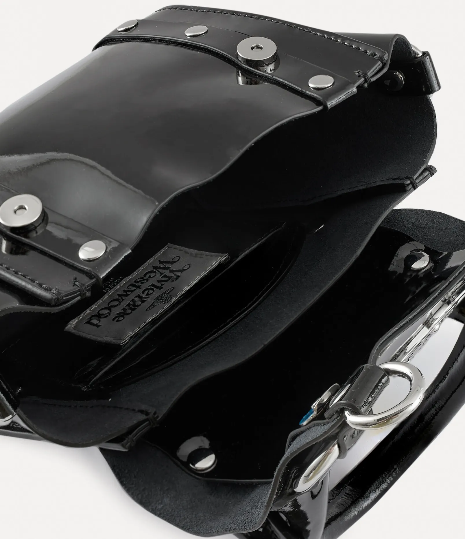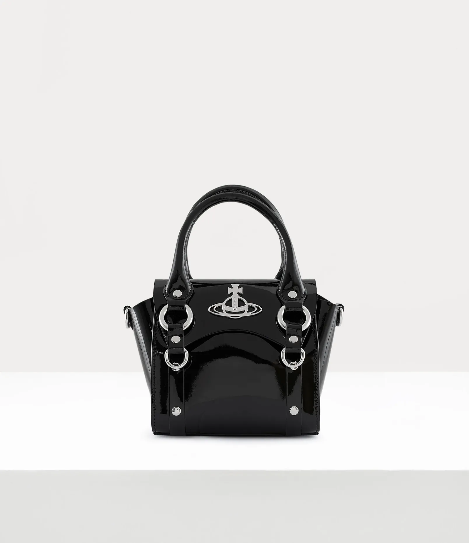 Our Betty Mini handbag features bondage-inspired elements, reminiscent of our ‘Erotic Zones’ collection from Spring-Summer 1995. The patent finish of this signature style is reminiscent of the pink latex signage and liquid latex sold in our iconic SEX boutique, now known as Worlds’ End.