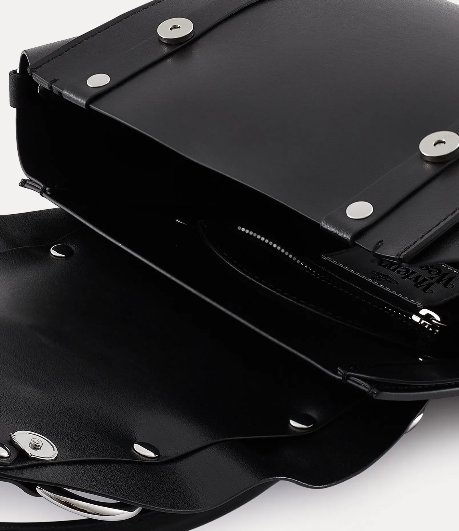 The Betty Small handbag is designed with bondage-inspired elements, reminiscent of our ‘Erotic Zones’ collection from Spring-Summer 1995. With an unlined interior and raw-cut edges for a natural, aged look, it features our metal orb plated on the front flap closure.
