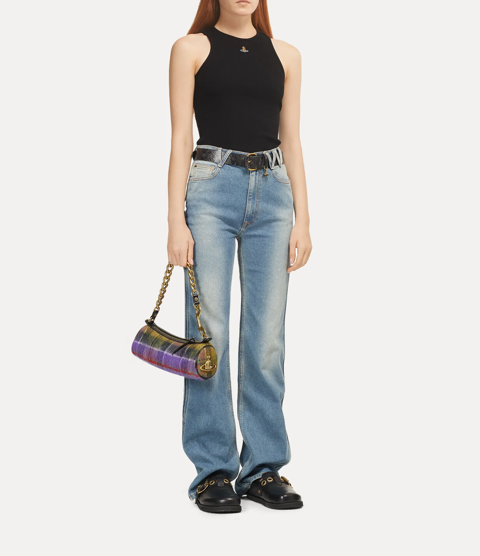 Our signature Cindy Cylinder bag is reimagined this season, drawing inspiration from the Vivienne Westwood Autumn-Winter 1985-86 ‘Mini-Crini’ collection. This updated design showcases our signature orb motif on the gusset, complete with a tartan mohair fabric, capturing the essence of Scotland’s rugged landscape of Scotland, created using a brushed effect technique.