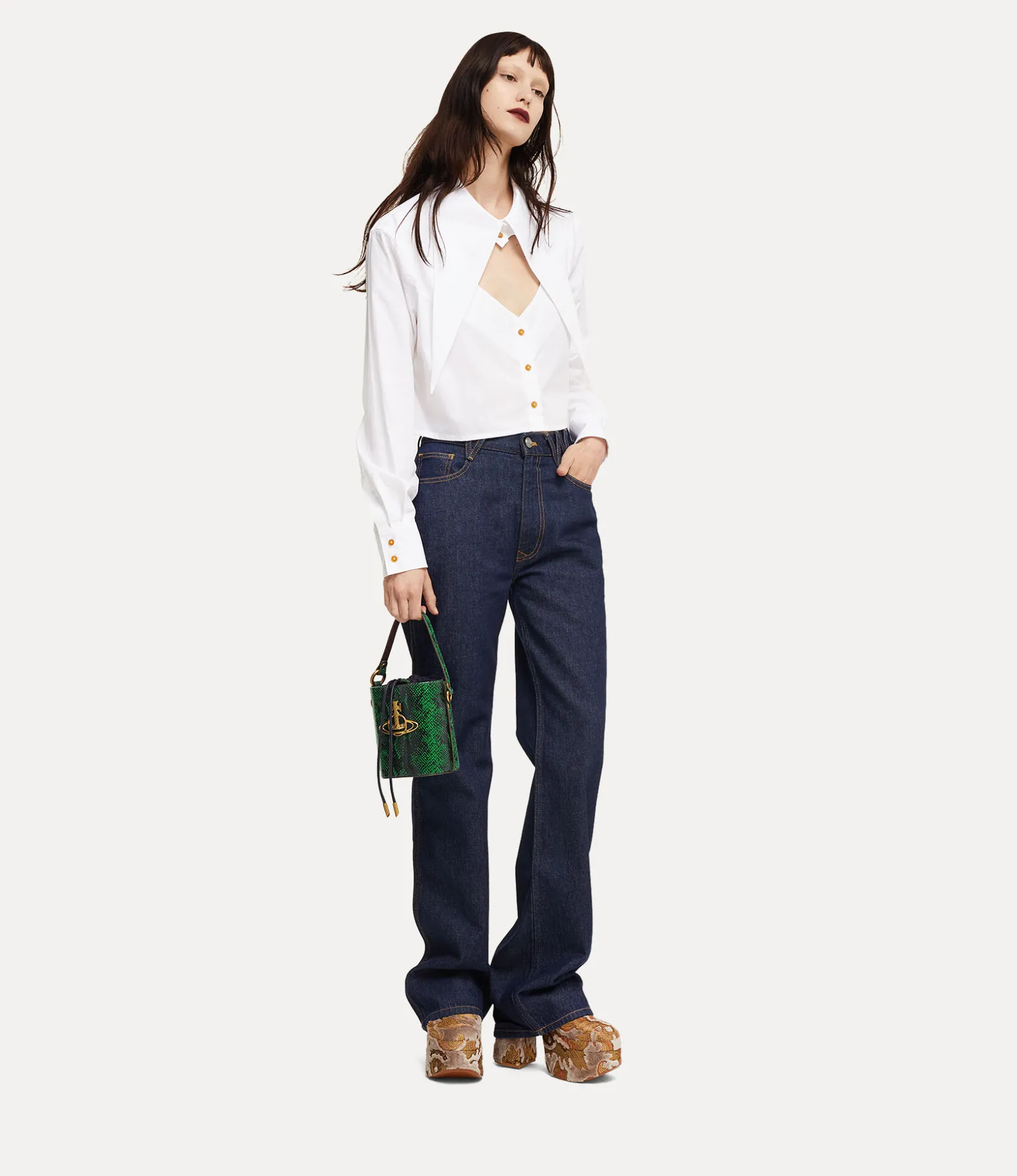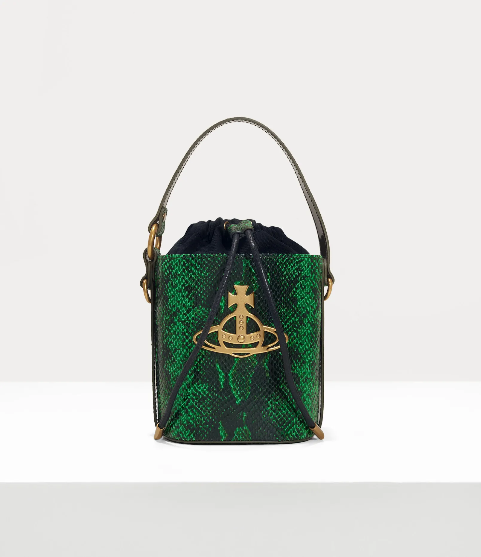 Our Daisy Drawstring Bucket bag receives a python-embossed motif, complete with a drawstring closure. The interior lining features the archive ‘Broken Pinstripe’ lining, which was first introduced in the Autumn-Winter 1993 Anglomania collection, while the line orb plaque on the front panel alludes to Vivienne’s vision for taking tradition into the future.
