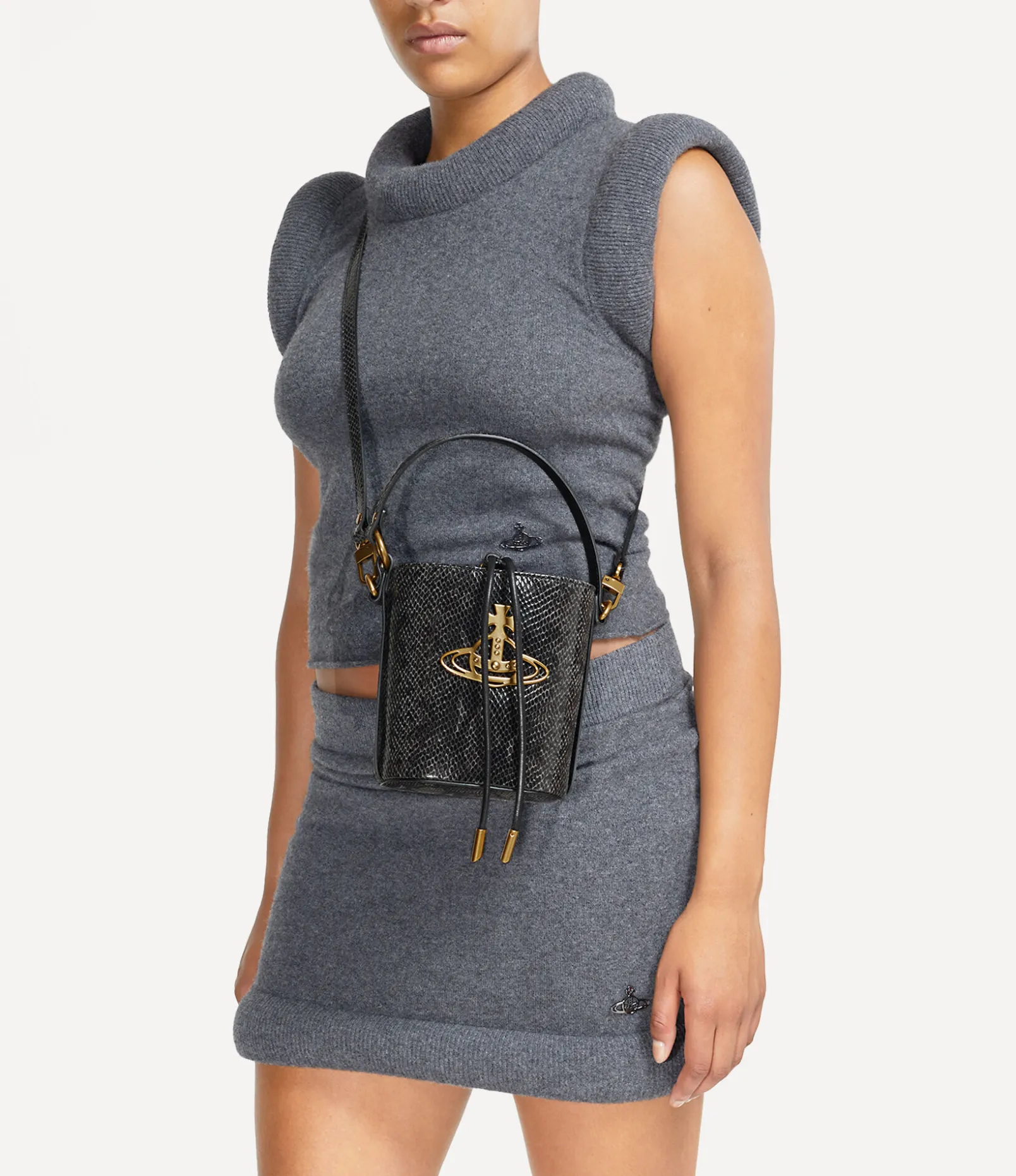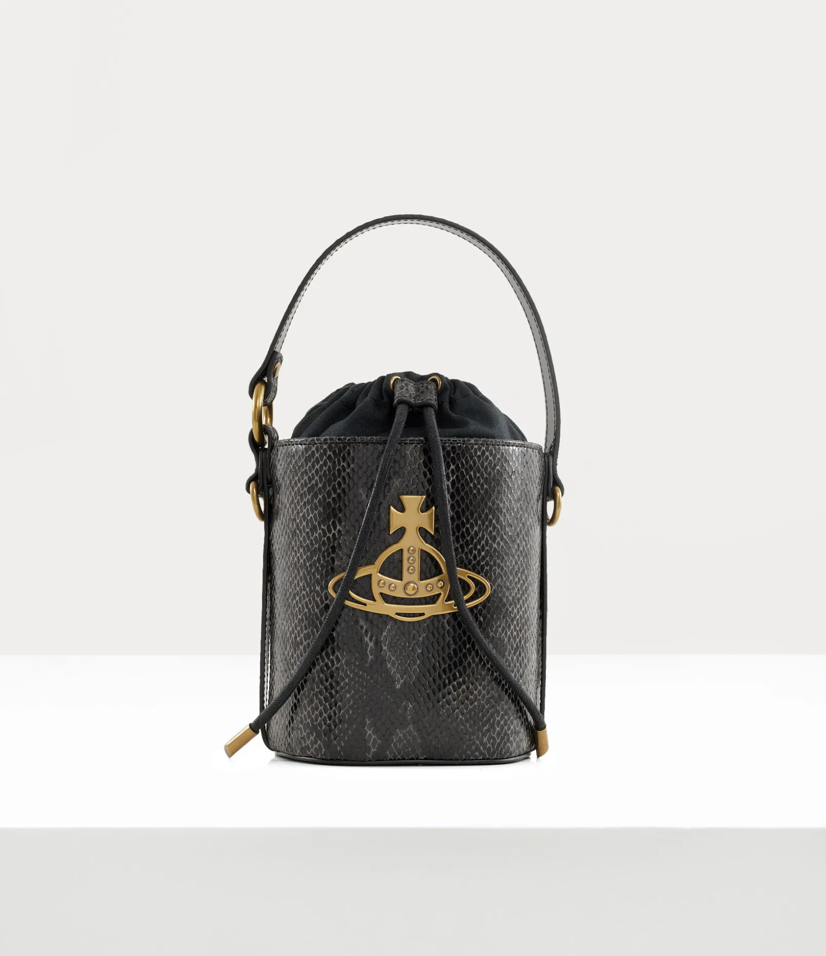 Our Daisy Drawstring Bucket bag receives a python-embossed motif, complete with a drawstring closure. The interior lining features the archive ‘Broken Pinstripe’ lining, which was first introduced in the Autumn-Winter 1993 Anglomania collection, while the line orb plaque on the front panel alludes to Vivienne’s vision for taking tradition into the future.