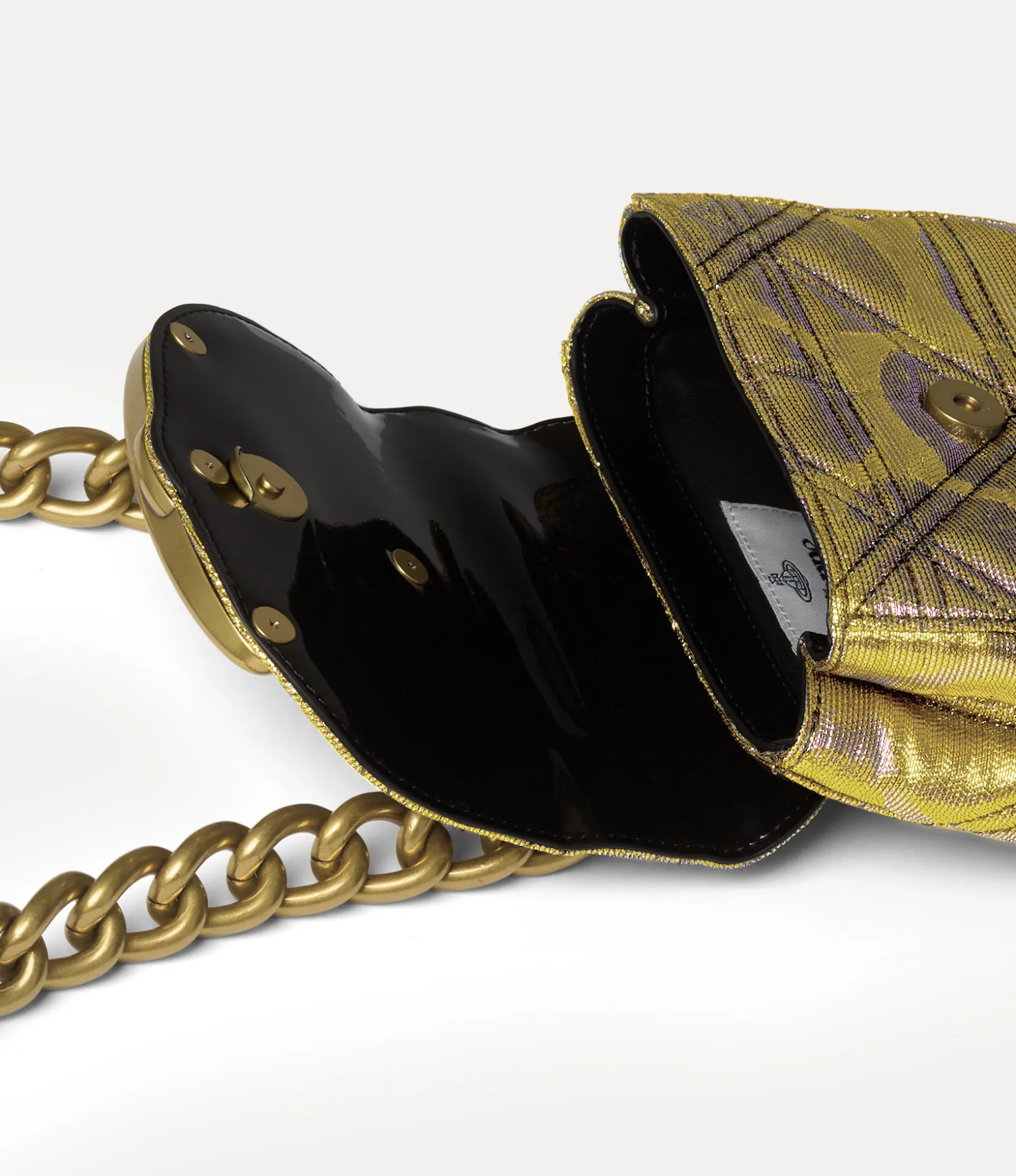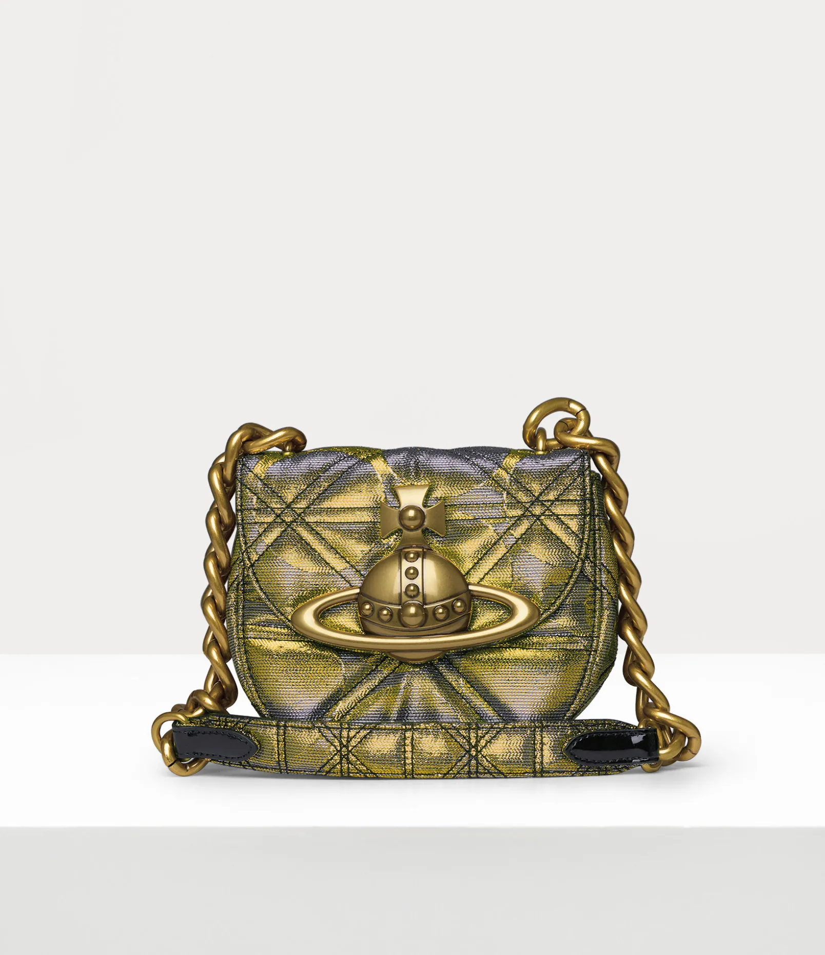 Our signature Jodie Saddle bag has been updated this season with a metallic lurex polkadot jacquard and a three-dimensional brass orb, reflecting Vivienne’s innovative approach to tradition. The classic Harlequin quilting, first introduced in Vivienne Westwood’s Autumn-Winter 1989 ‘Voyage to Cythera’ collection, adds a unique and dimensional appearance to the bag.