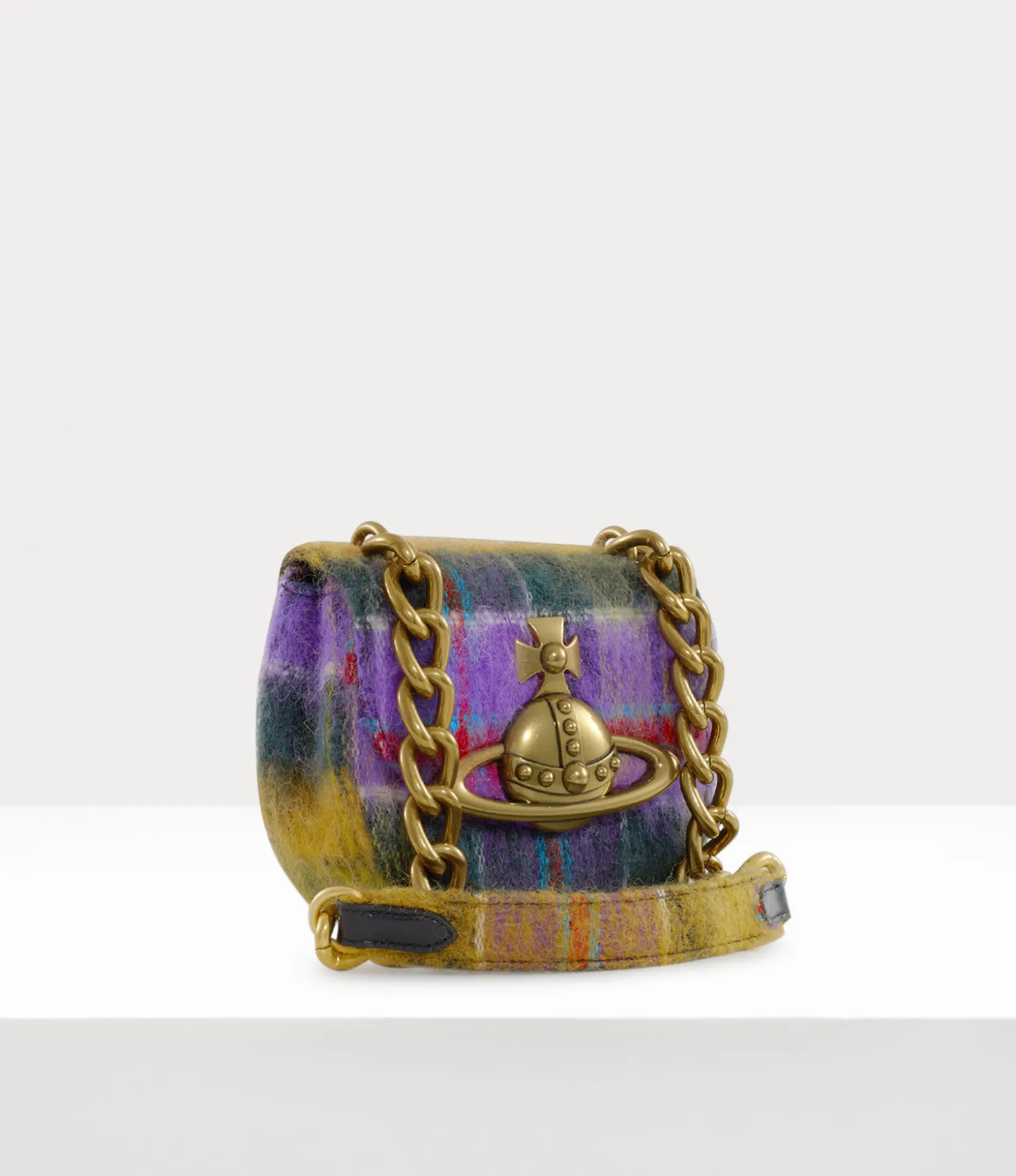 The Vivienne Westwood Jodie Saddle bag returns this season with a tartan mohair finish, which emphasises the Neo-classical inspirations of the collection. The piece adopts the signature broken pinstripe interior lining, a unique twist on the traditional pinstripe, complete with a three-dimensional brass orb plaque – synonymous with Vivienne’s vision of launching tradition into the future.