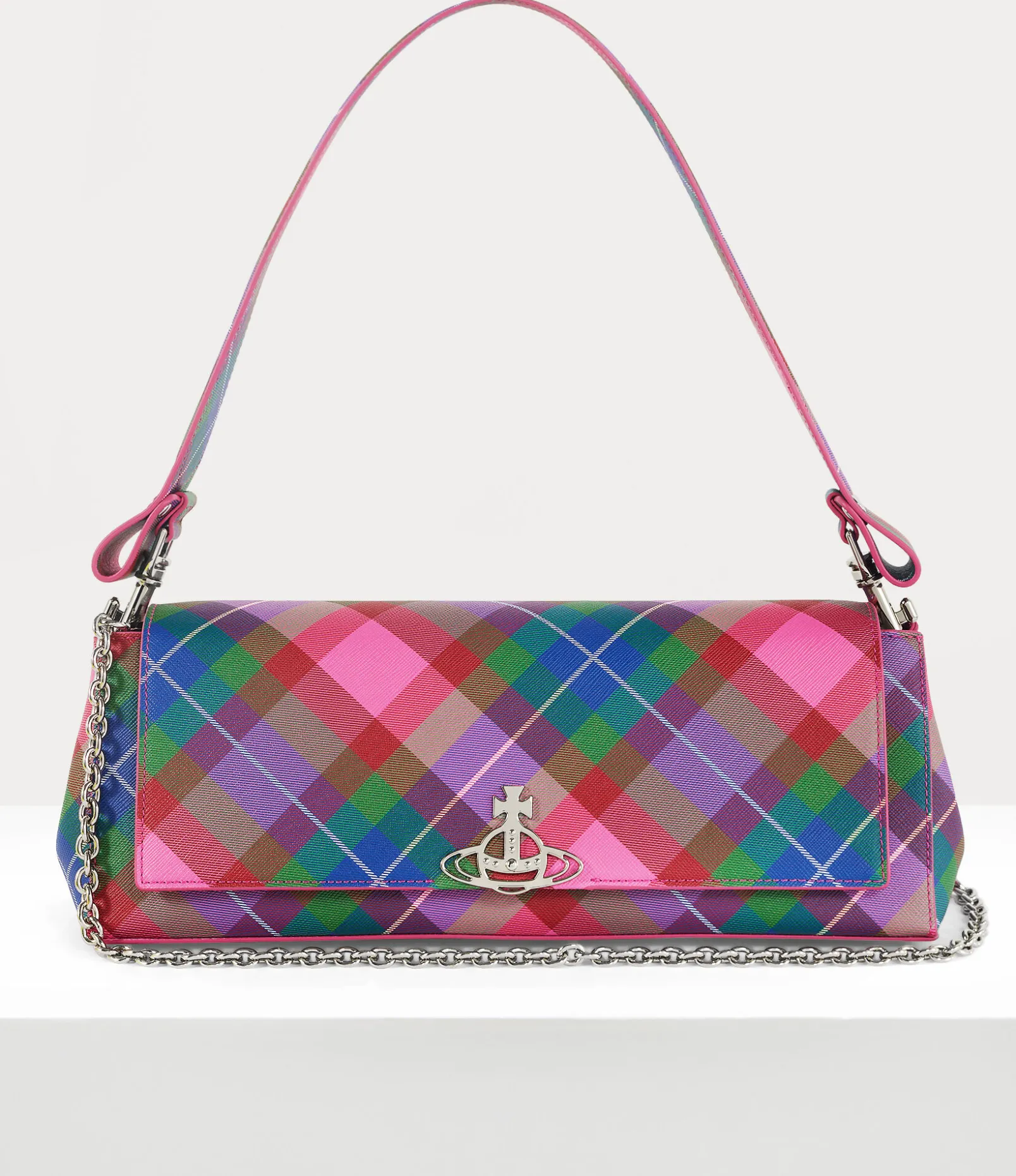 Our Large Hazel handbag is the latest development of the signature Hazel range. This season, the piece receives our ‘Candy Tartan’ motif, inspired by the wild beauty of the Scottish Highlands, complete with an orb plaque on the magnetic closure – synonymous with Vivienne’s vision of launching tradition into the future.