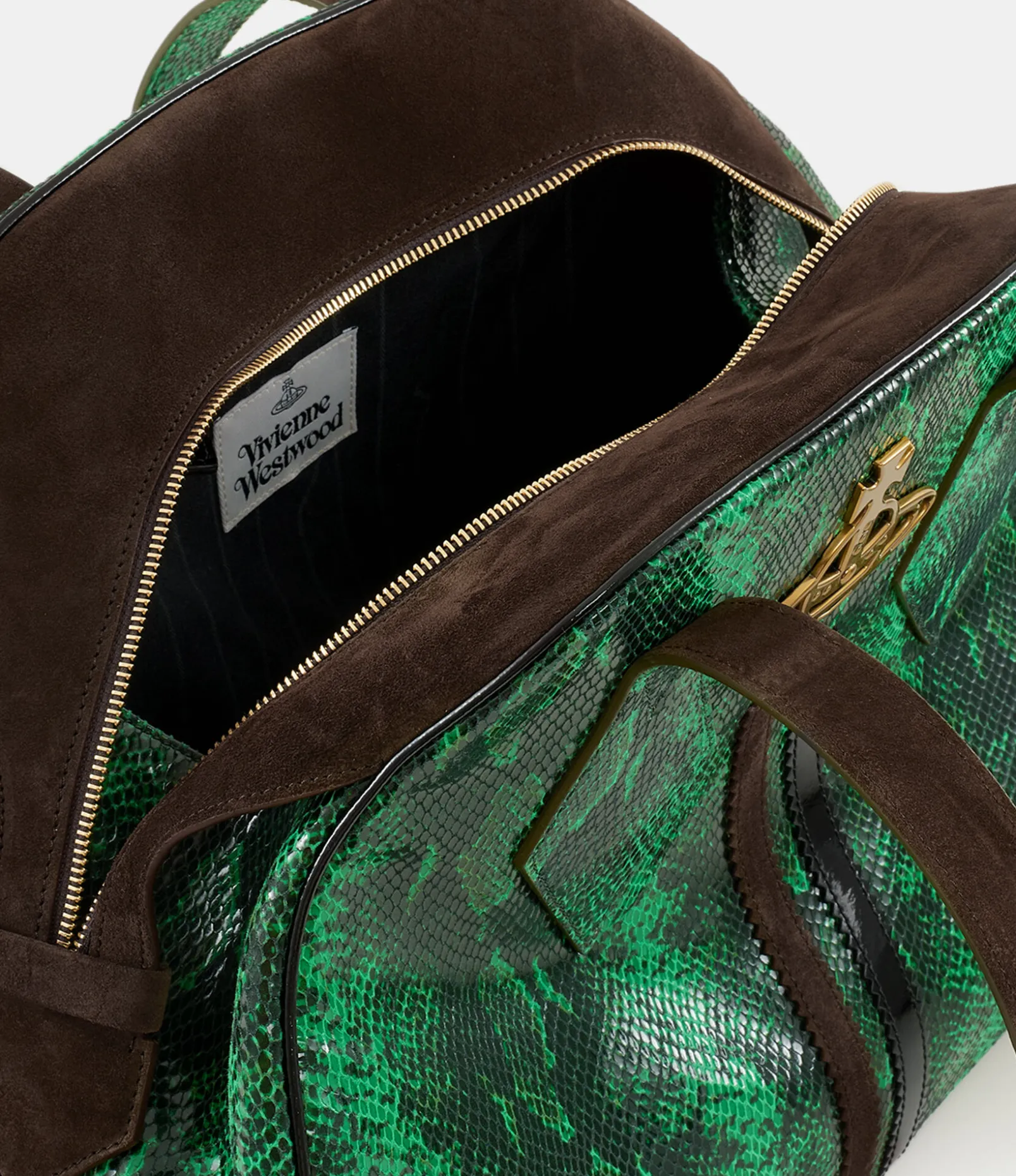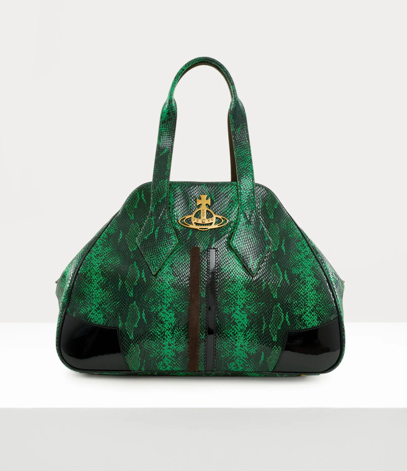 The Large Yasmine bag pays tribute to the iconic ‘Yasmine’ design from the Autumn-Winter 1987/1988 Time Machine collection. This larger version features the new ‘snakeskin’ pattern, inspired by our Hammerhead trainers from the 1982 ‘Savage’ range. The double appliqué down the centre, a nod to the Tracey trainer’s two stripes, adds a sporty touch, while the metal orb plaque on the front symbolises Vivienne’s innovative approach to blending tradition with the future.