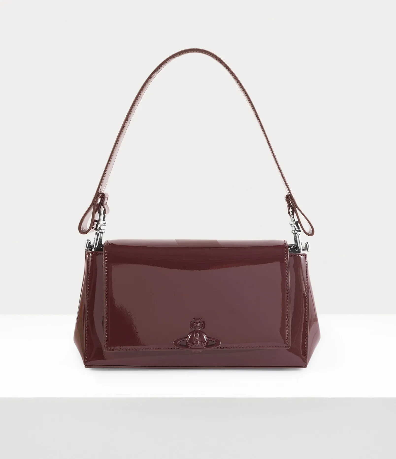 Our Medium Hazel handbag features an all-over patent finish, reminiscent of the liquid latex and rubberwear sold in our iconic SEX boutique, now known as Worlds’ End. The piece is enhanced by our enamel orb branding on the magnetic fastening, evoking Vivienne’s vision of launching tradition into the future, complete with a soft cotton lining.