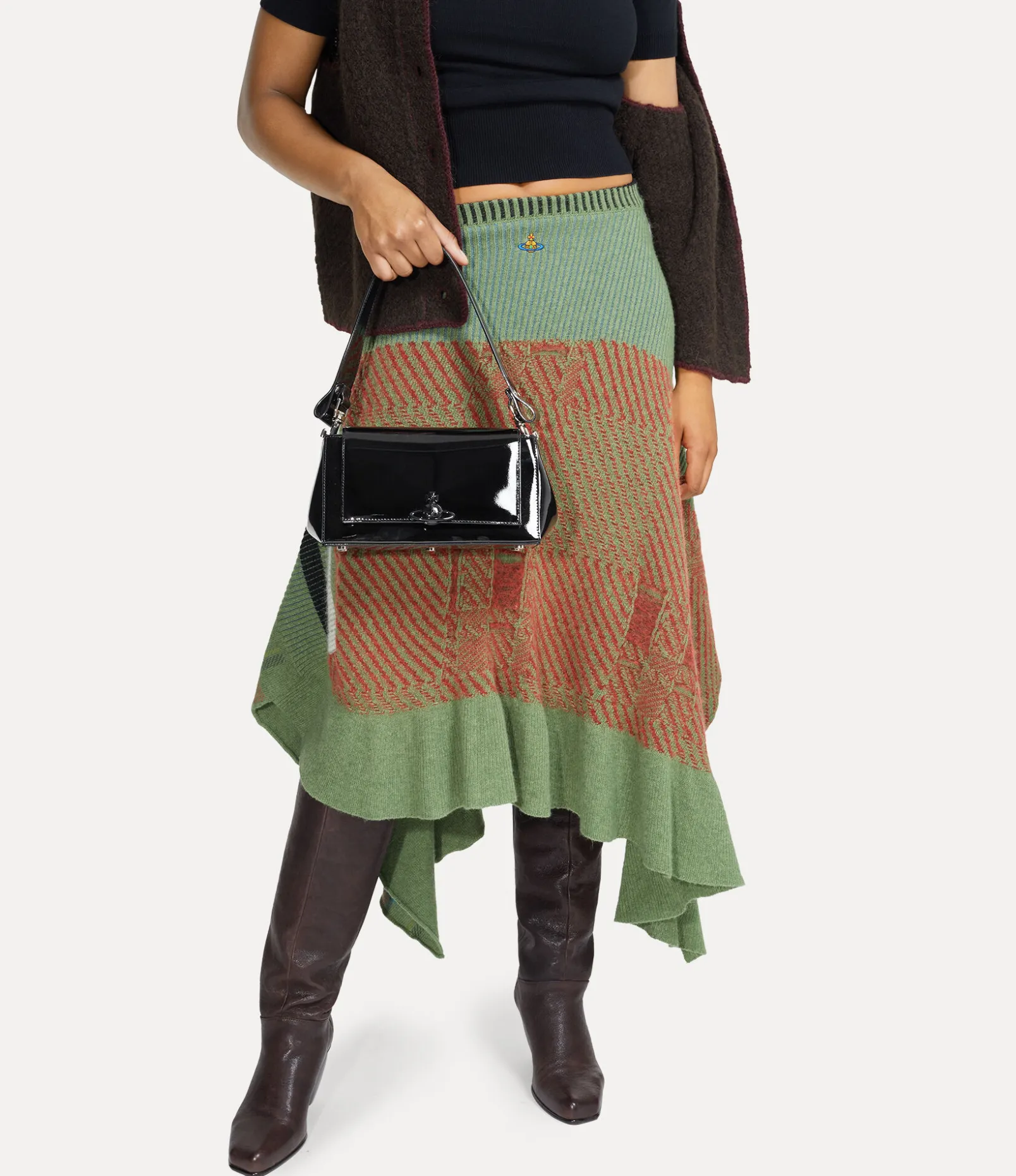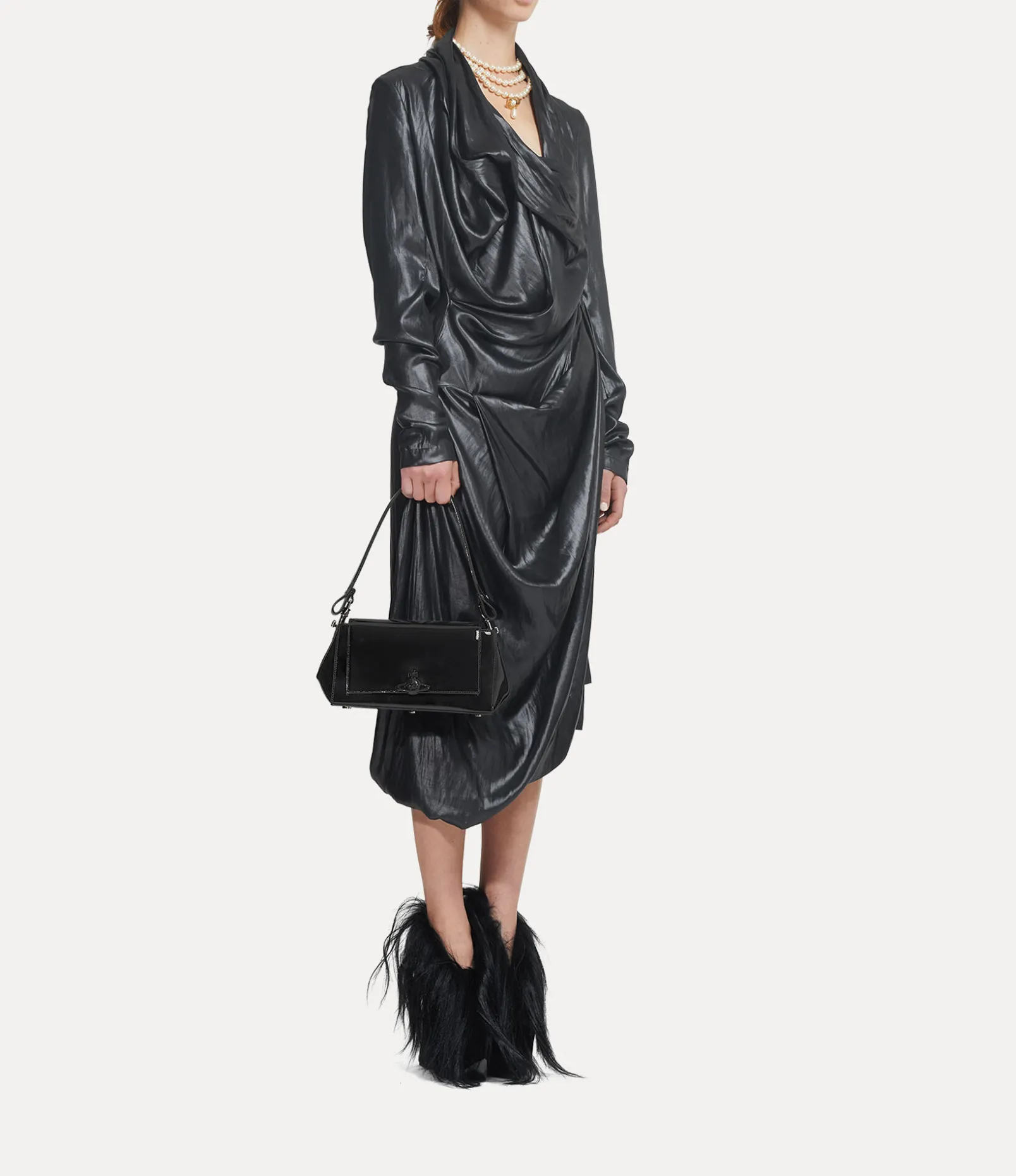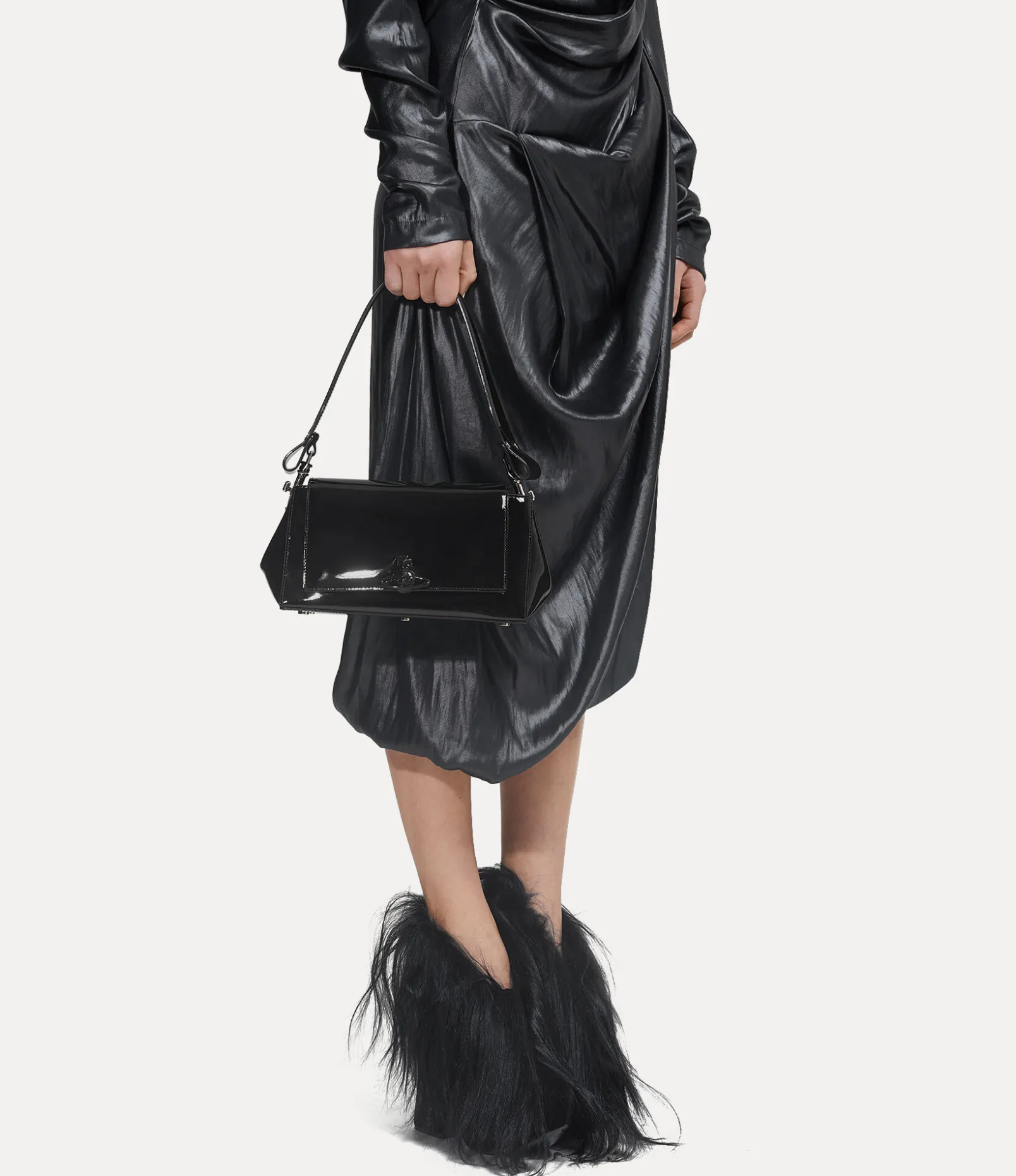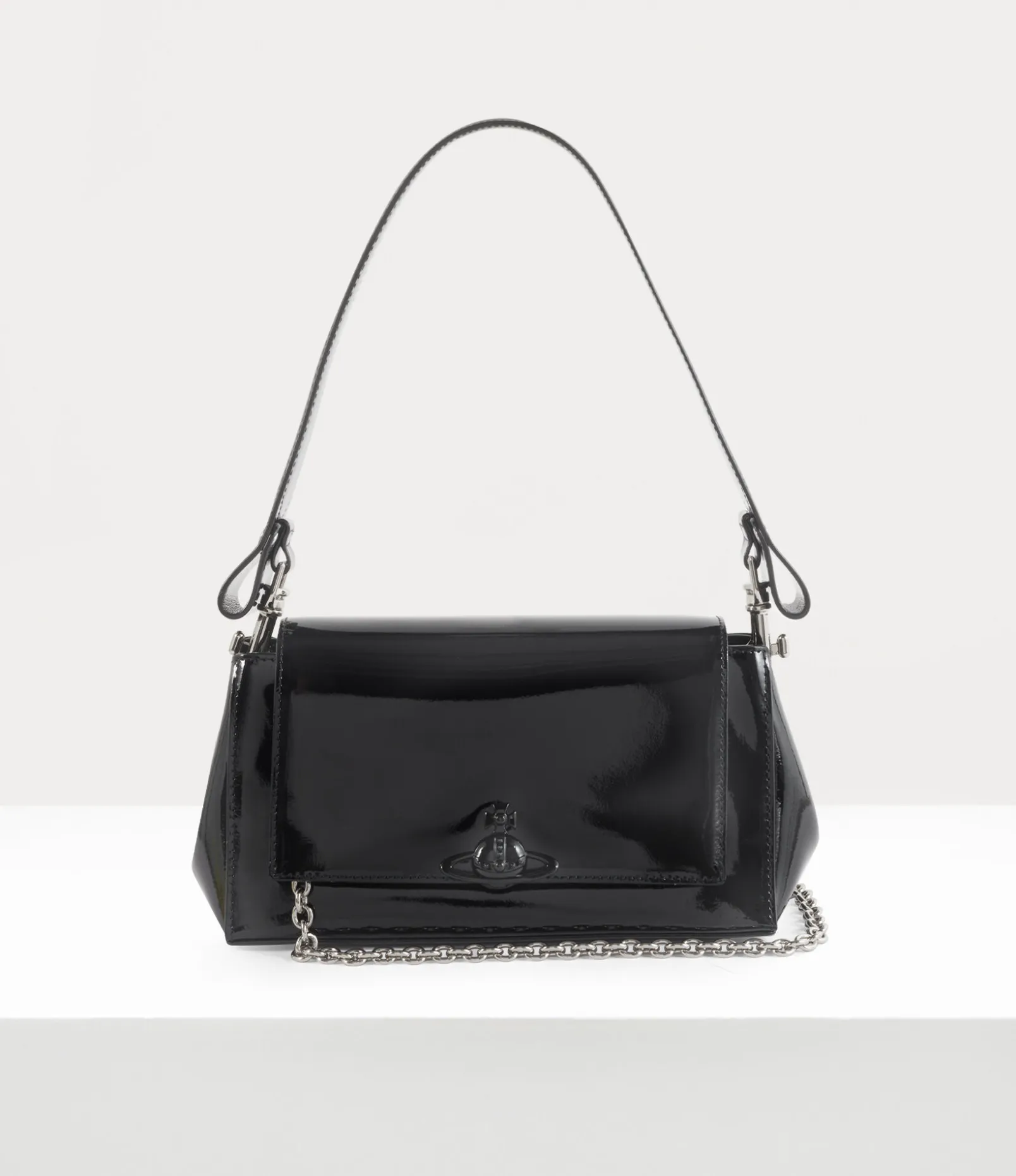Our Medium Hazel handbag features an all-over patent finish, reminiscent of the liquid latex and rubberwear sold in our iconic SEX boutique, now known as Worlds’ End. The piece is enhanced by our enamel orb branding on the magnetic fastening, evoking Vivienne’s vision of launching tradition into the future, complete with a soft cotton lining.