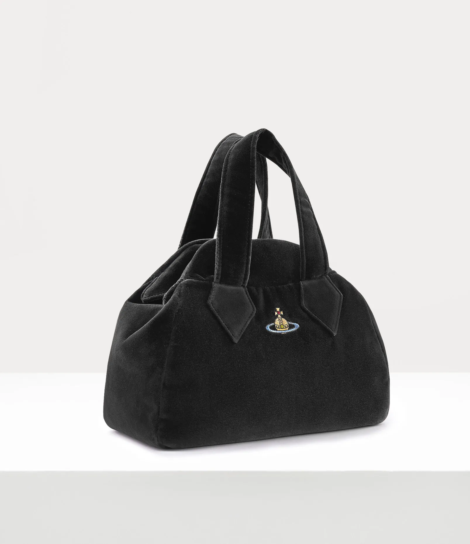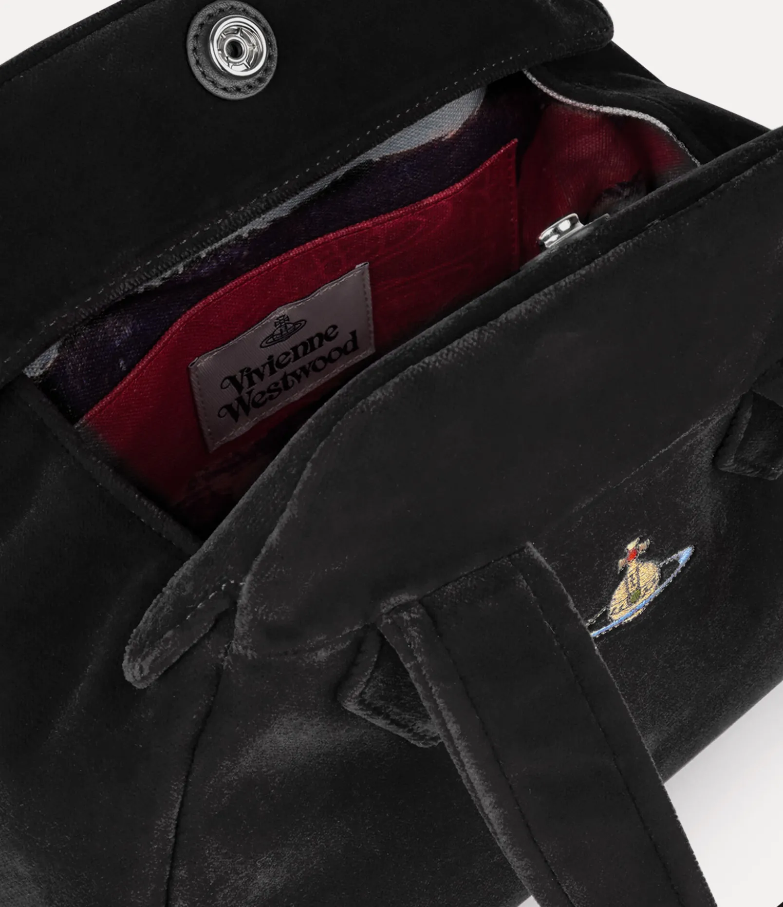 The Medium Yasmine handbag is a new development of our archive Yasmine handbag, first presented at the Gold Label Autumn-Winter 1987/88 runway show titled ‘Time Machine’. This season, the piece receives a soft cotton velvet silhouette, complete with an embroidered orb on the front panel – alluding to Vivienne’s vision of taking tradition into the future.