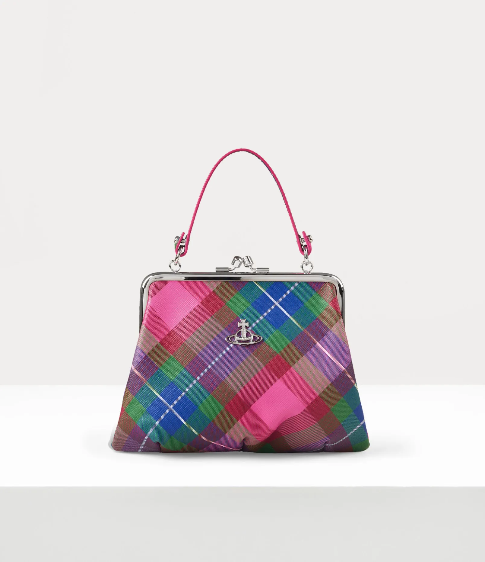 Our Granny Frame purse features vintage-inspired elements, reminiscent of antique coin purses. The design adopts our new candy tartan motif, lending it a softer look, complete with a grained surface and a silver-tone orb plaque on the front panel – synonymous with Vivienne’s vision for launching tradition into the future.