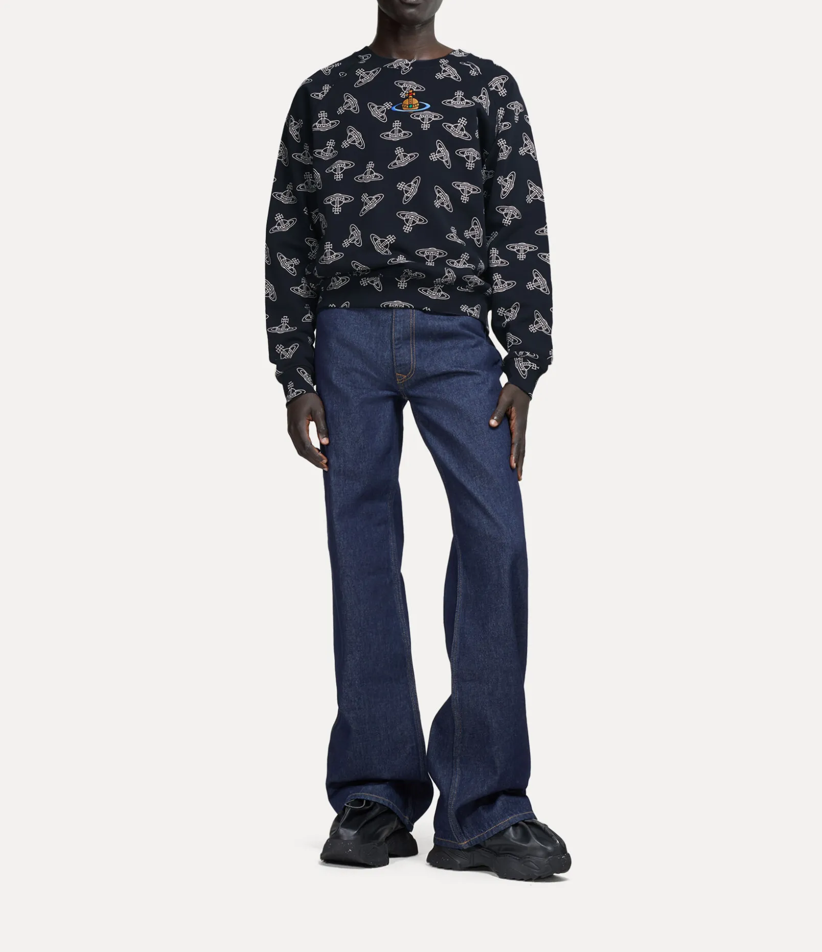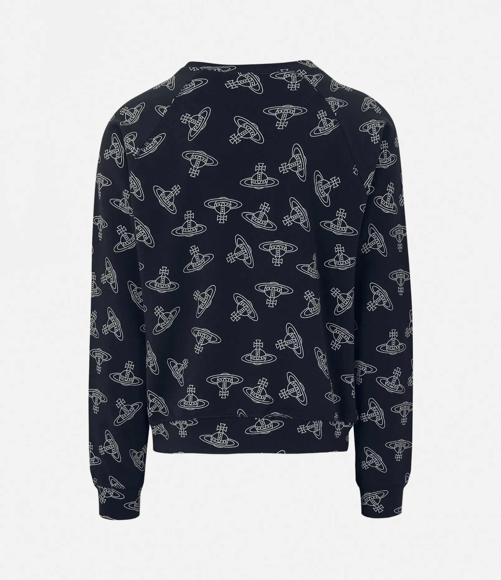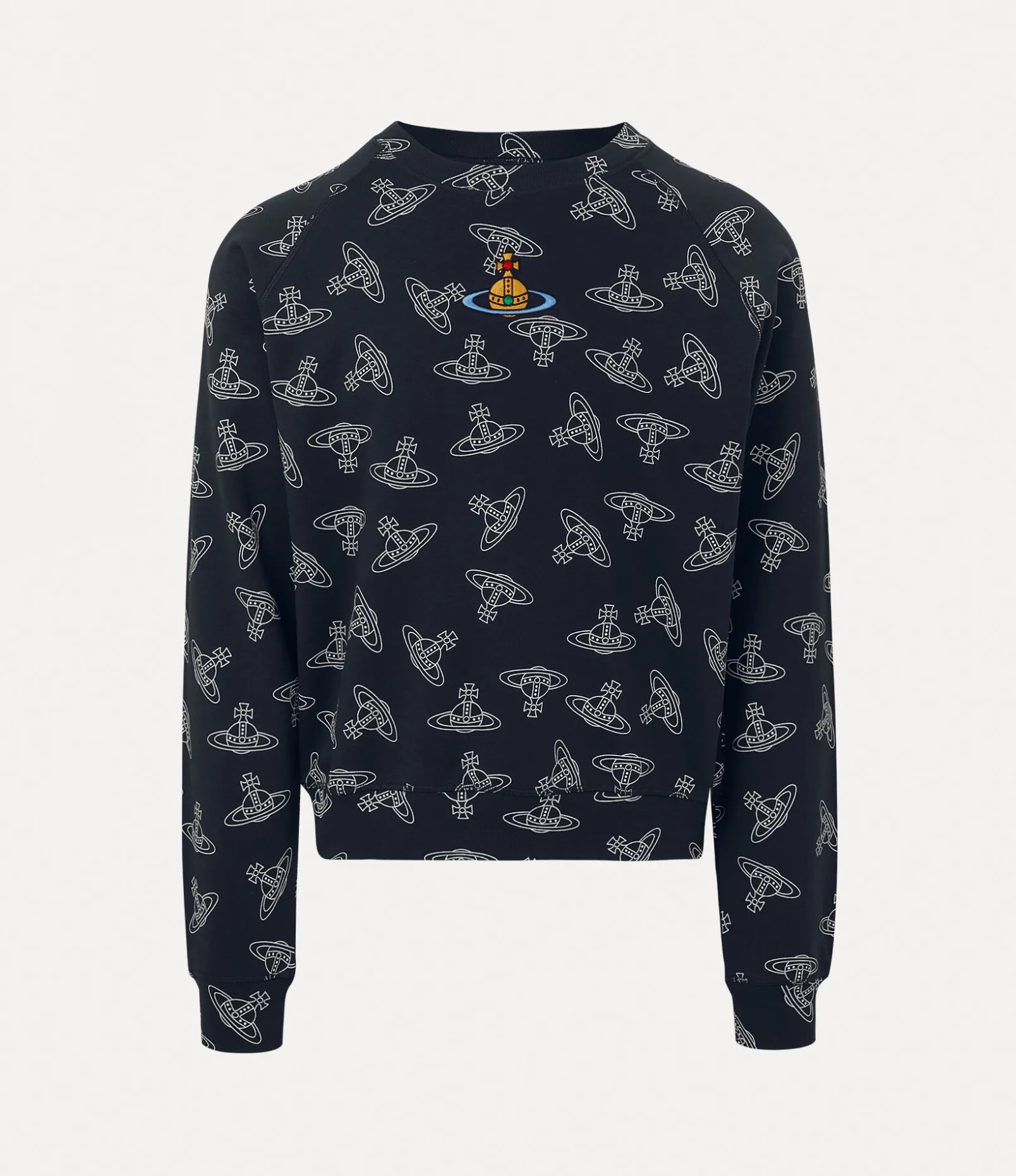 The signature Raglan sweatshirt draws inspiration from the house’s archive, showcasing an orb jacquard pattern across the design and a vibrant multicoloured orb embroidery at the center. This iconic detail embodies Vivienne’s innovative blend of tradition and modernity.