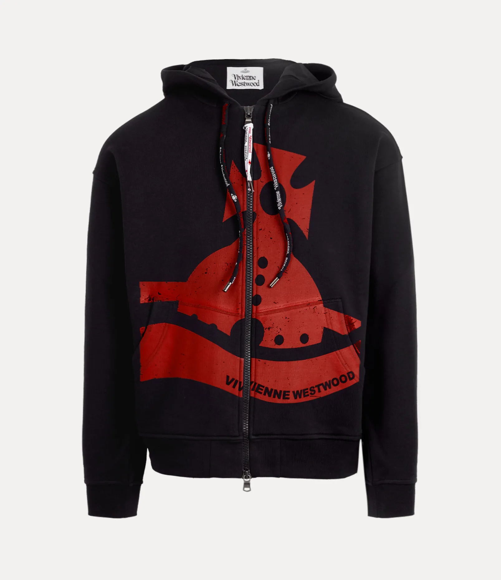 The house’s orb silhouette is synonymous with Vivienne’s vision of launching tradition into the future. Our Zip hoodie features this season’s printed ‘Sunken Orb’ motif on the front of the design, accompanied by the distinctive Vivienne Westwood lettering.