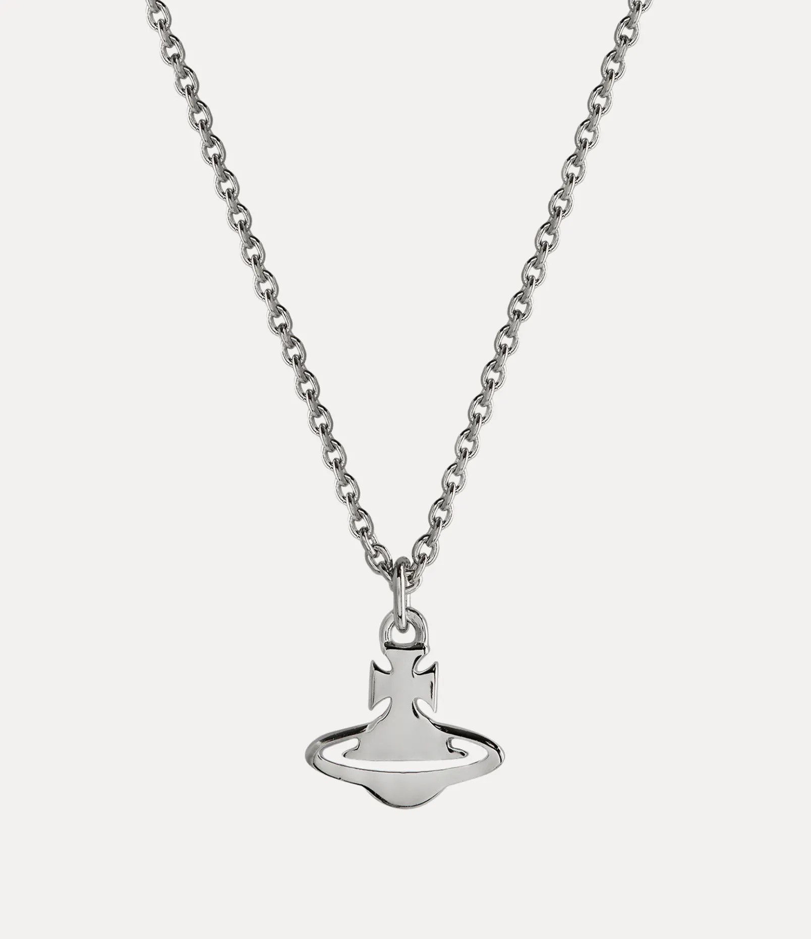 Our Carmen Pendant necklace features a platinum-tone silver finish, complete with a two-dimensional orb silhouette, representing Vivienne Westwood’s vision of launching tradition into the future. The piece receives a trace chain, which secures with lobster-clasp fastening at the back.