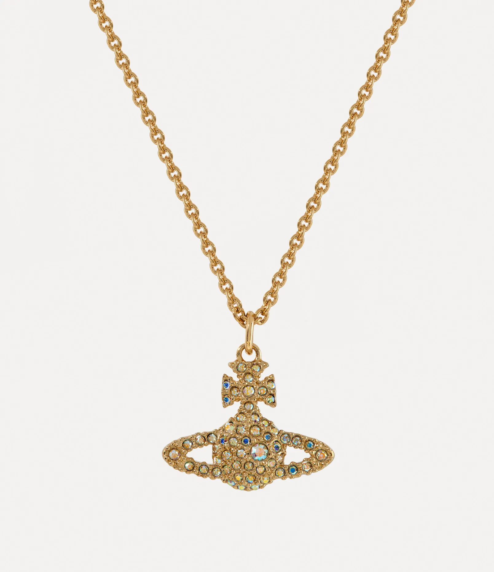 In homage to Vivienne’s vision of launching tradition into the future, the Grace Bas Relief Pendant necklace showcases a two-dimensional orb motif at its center. The design receives a surface of iridescent crystals decorating the silhouette, complete with polished, gold-tone plating to finish.