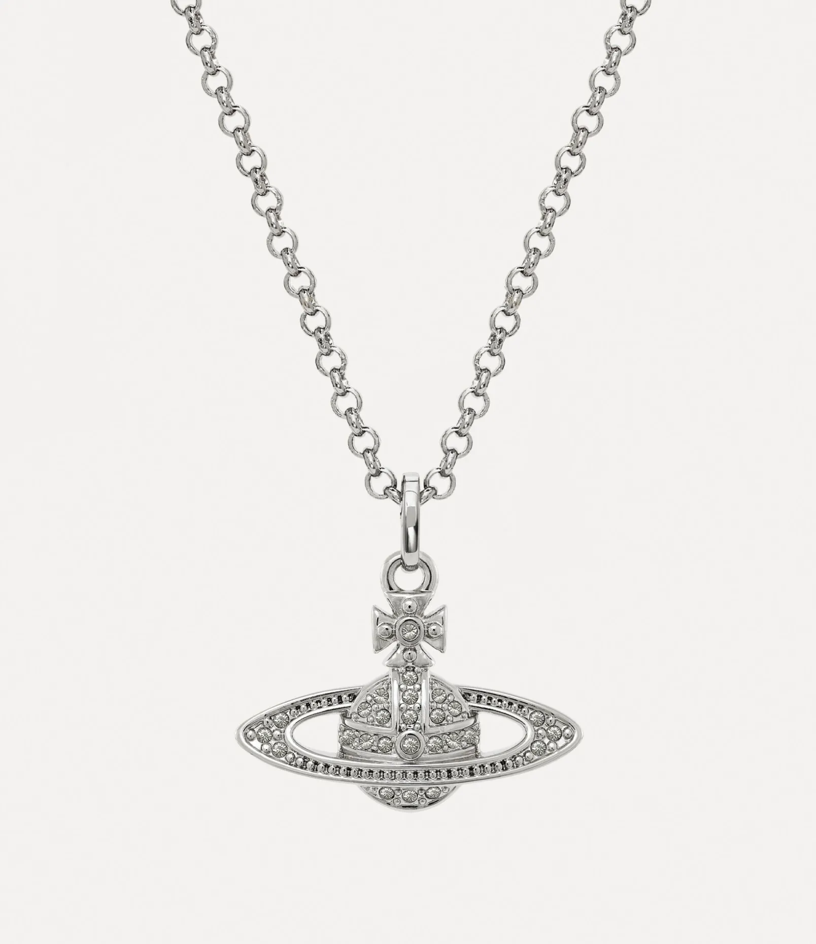 The orb is an essential element of the house’s iconography, evoking Vivienne’s vision of launching tradition into the future. Our Mini Bas Relief Pendant necklace features a crystal-encrusted orb at the centre of the design, complete with an engraved tag at the classic lobster clasp.